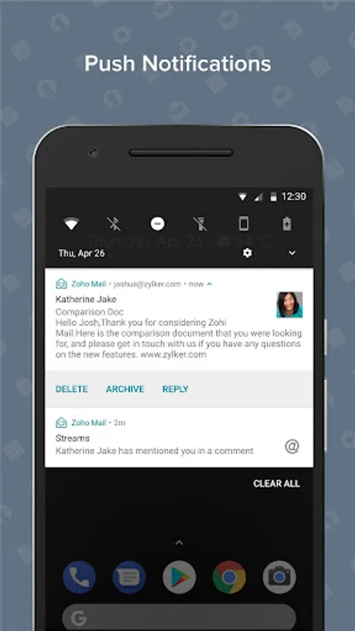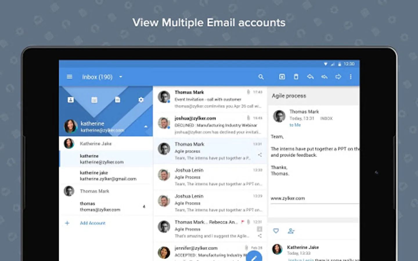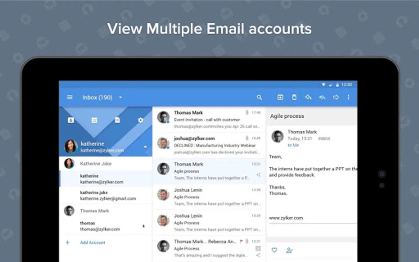 Multiple account support - Add and switch between your different Zoho email accounts. Or view it all in one go through the unified Inbox with push notifications.