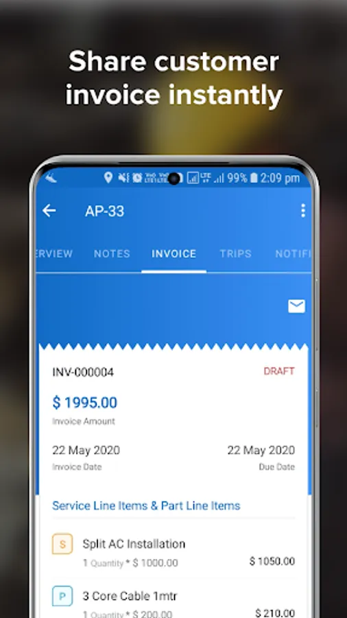 Generate invoices quickly after job completion and share them with the customer.