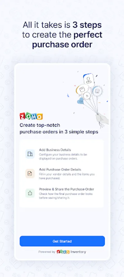 Zoho Inventory's purchase order generator app helps you create quick and professional purchase orders at any time from anywhere. Simply fill out the template and share the PDF with your supplier online, or save a copy of it on your device.
