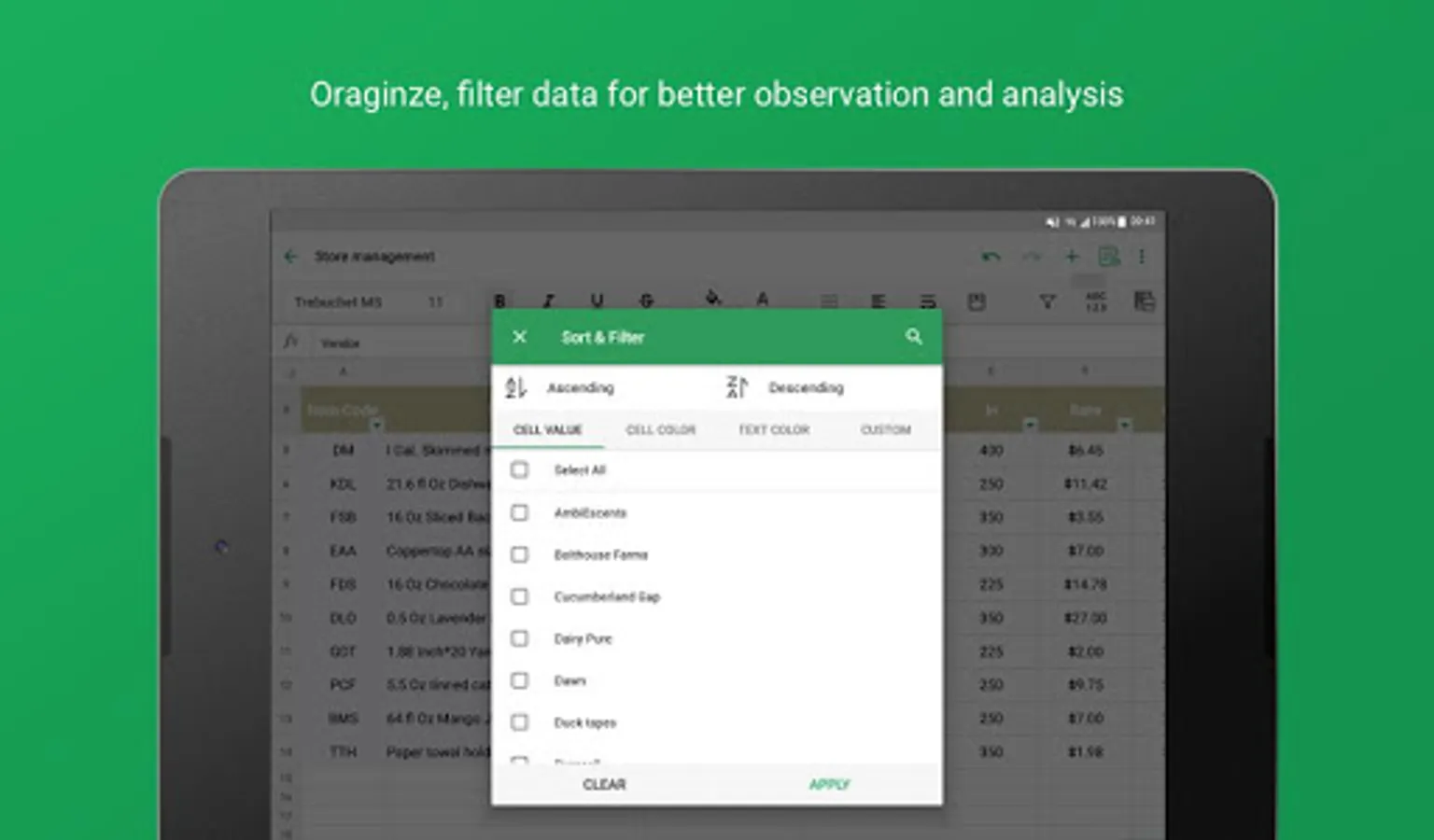 Work on all your budgets, accounts, reports, task lists, and other data with your team, on the go using your mobile devices. With the Zoho Sheet app, your office is wherever you are!