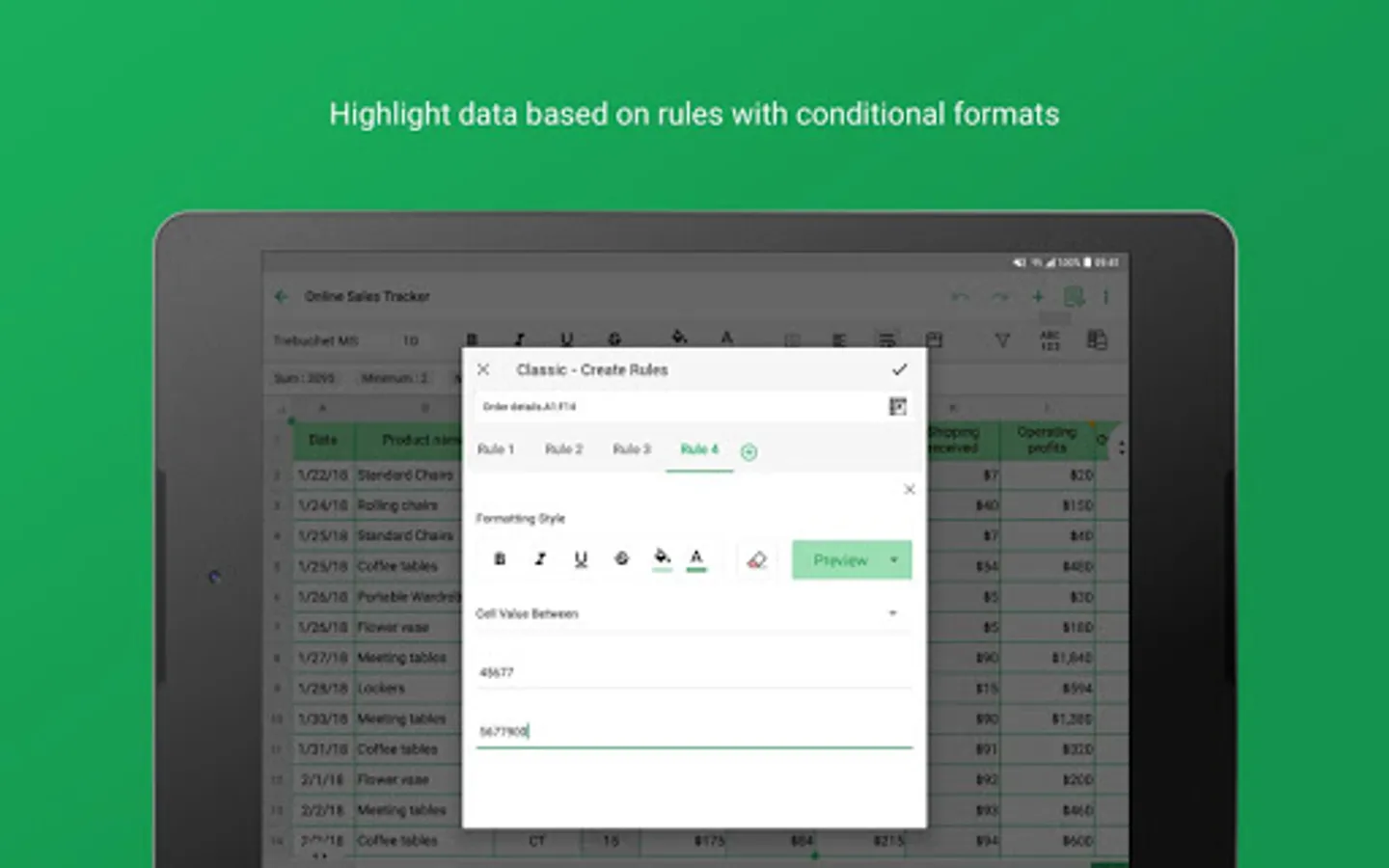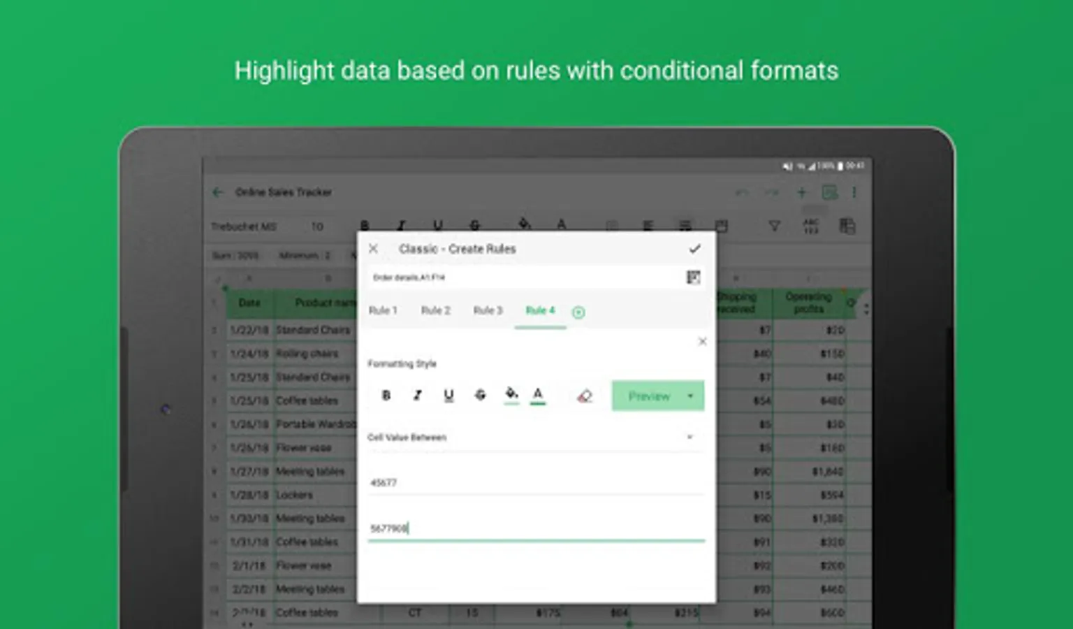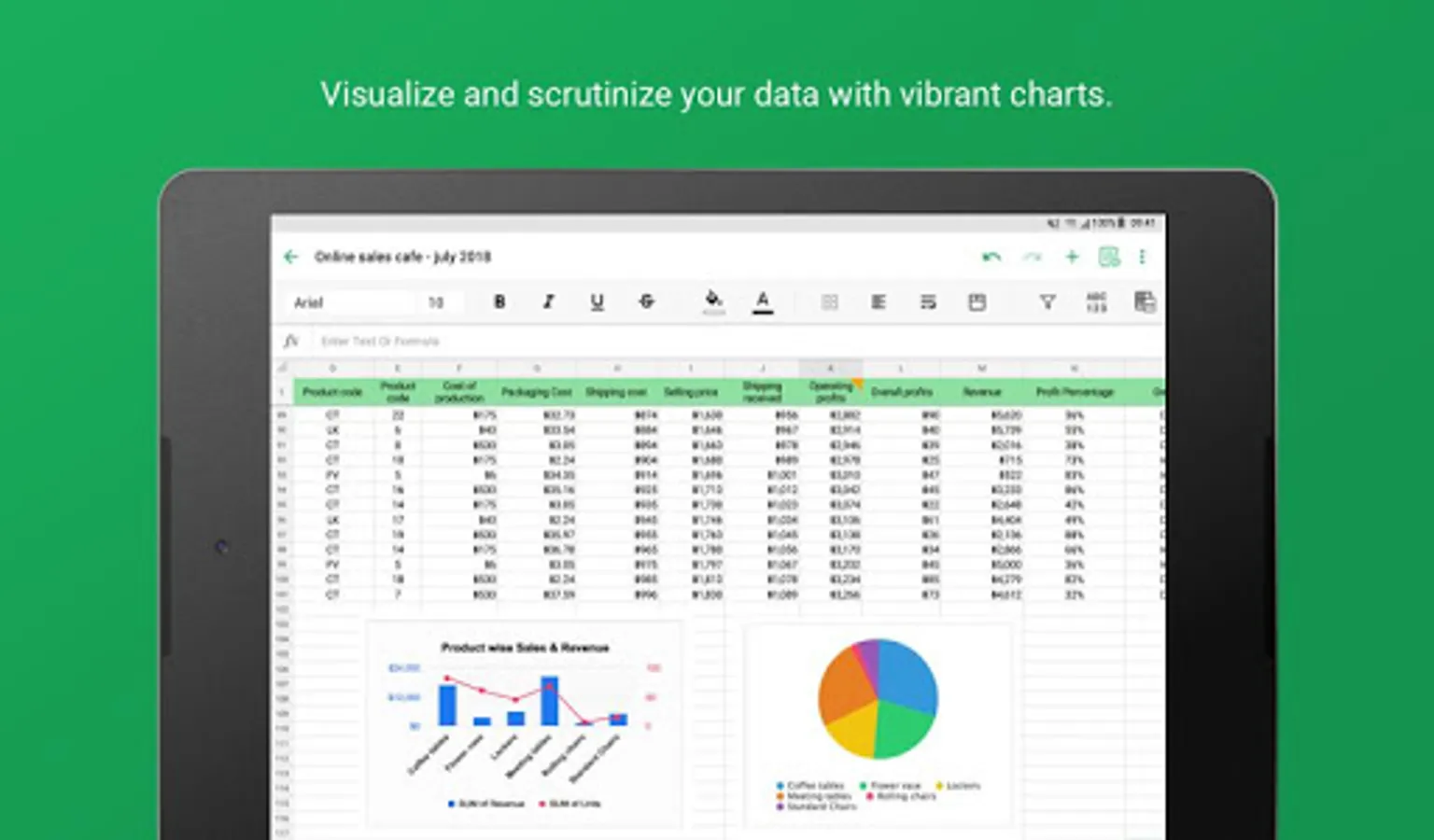 • Contextual suggestions, a range picker, and the help guide right within the app, let you work seamlessly with formulas.