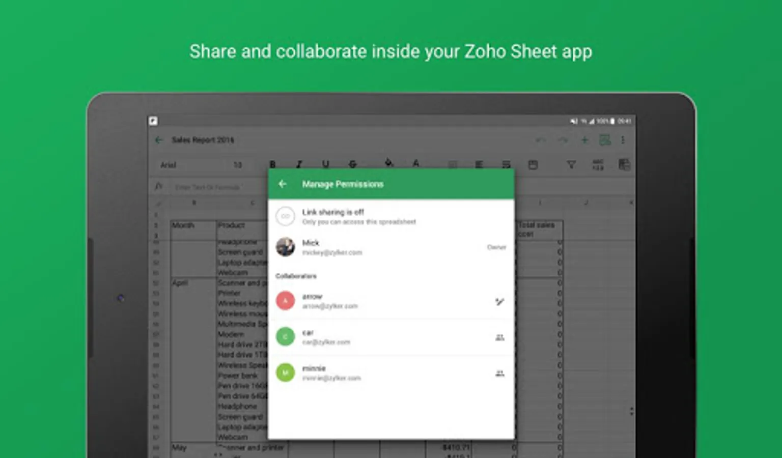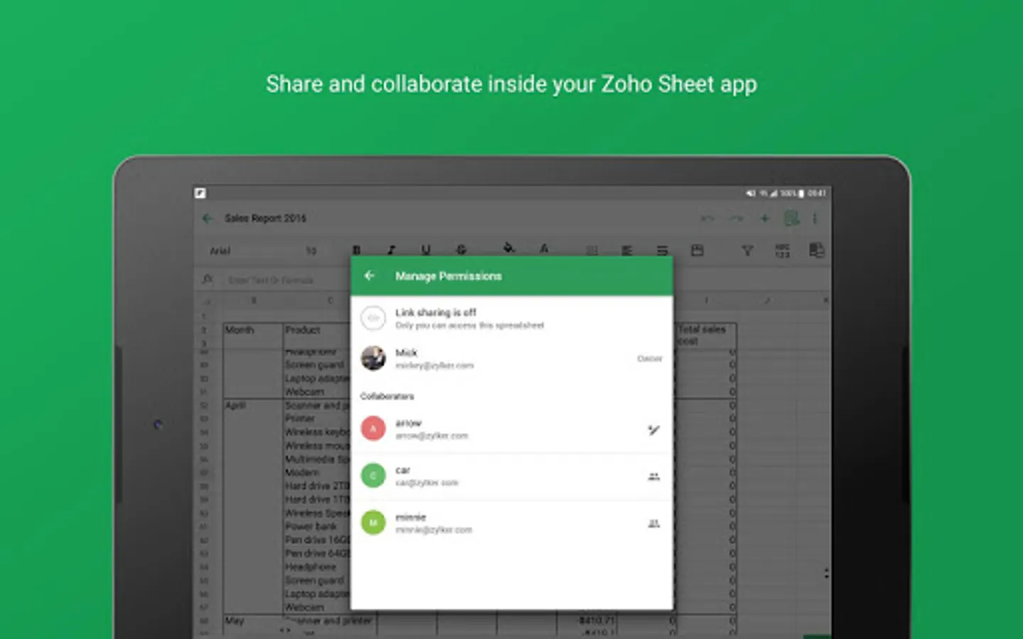 • Share your spreadsheets with your colleagues using four levels of access permissions including read only, read/write, read/comment, and co-owner.
