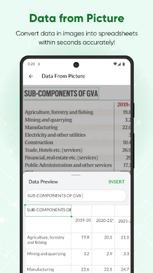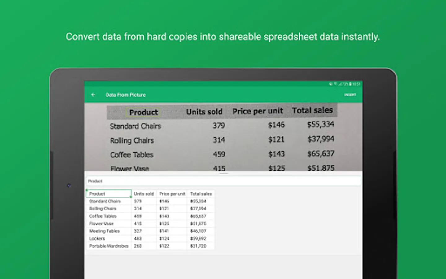 • Convert printed copies of tabular data into spreadsheet data in an instant using Data from Picture. Just take a picture, convert it into a spreadsheet, preview, and insert it into the desired range.