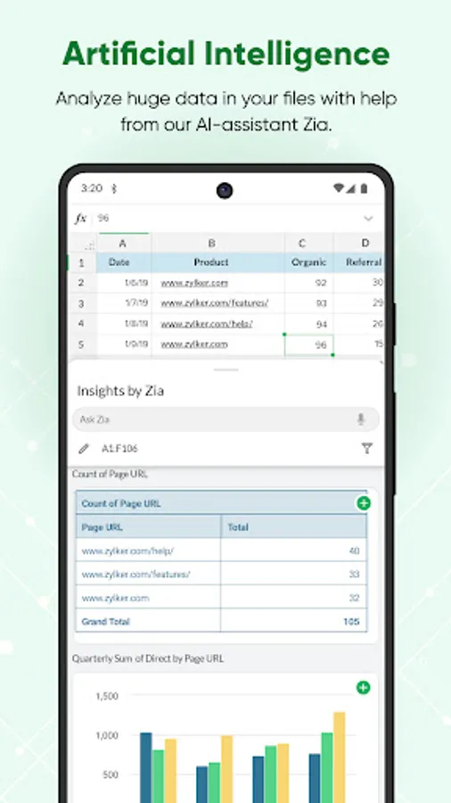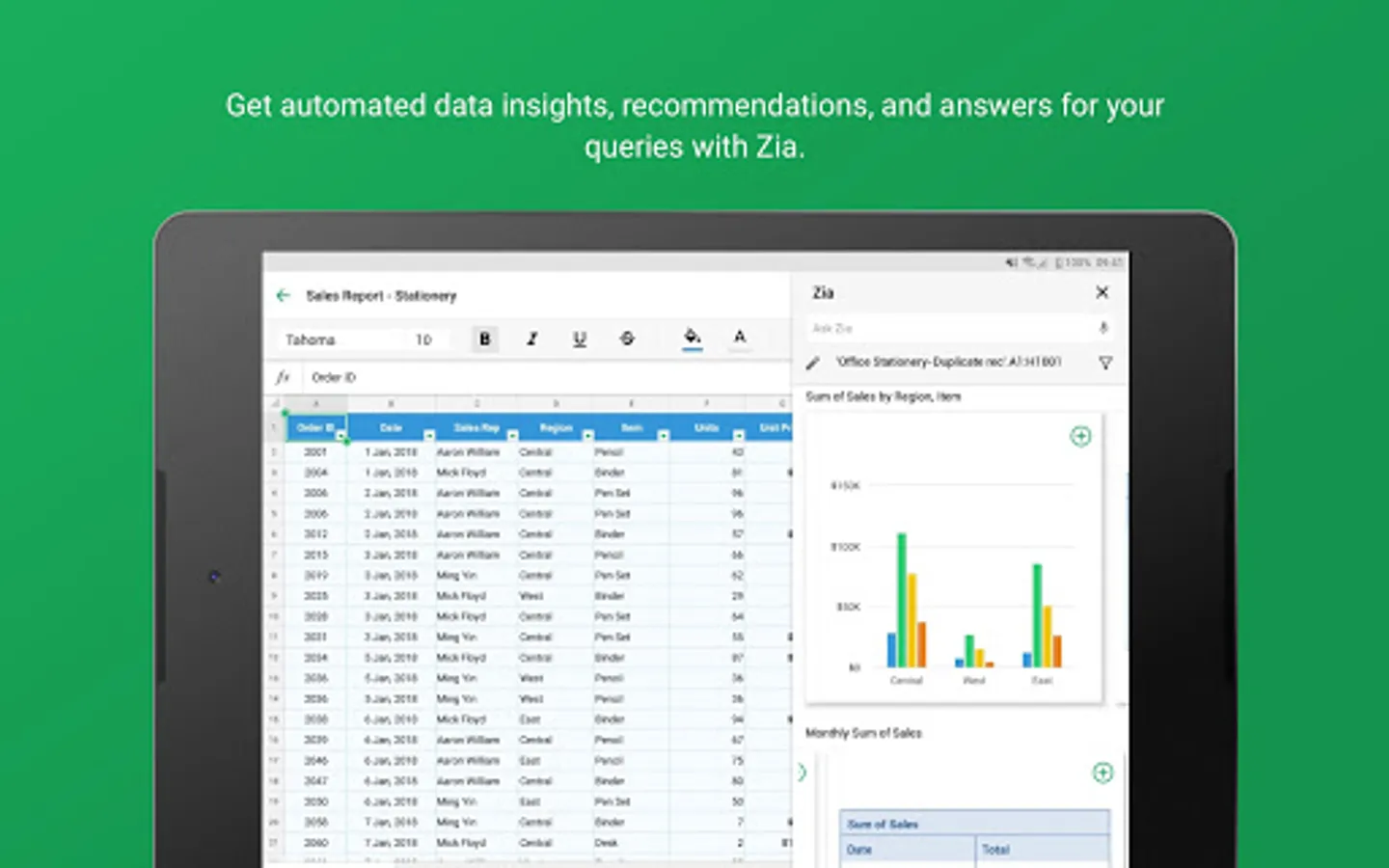 • Get help from Insights by Zia, our AI-powered analytical assistant. Insights by Zia recommends charts, creates pivot tables, and answers all data-related questions. It supports voice command too.