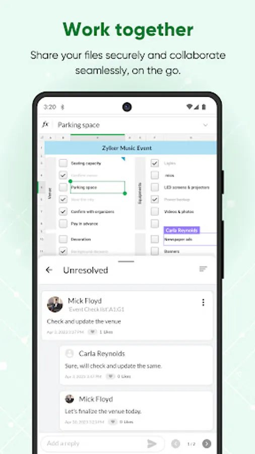 • Collaborate in real time, make cell- and range-level comments and discuss with your team inside the sheet, even when away from your office.