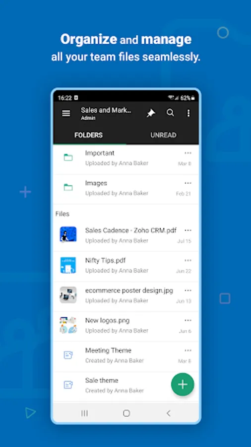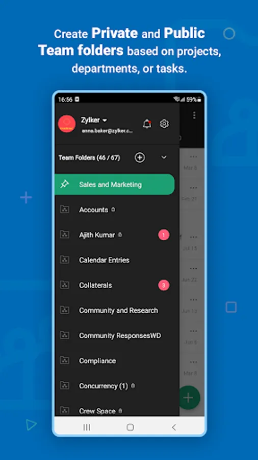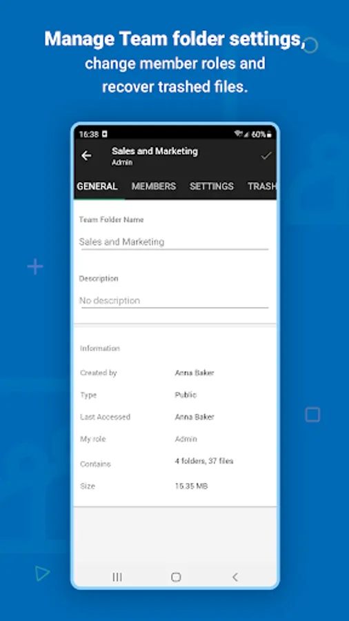 Work as a team: Create Team Folders, add members, and assign role-based access to them. You can modify settings, monitor trash, and restore deleted files with a tap.
