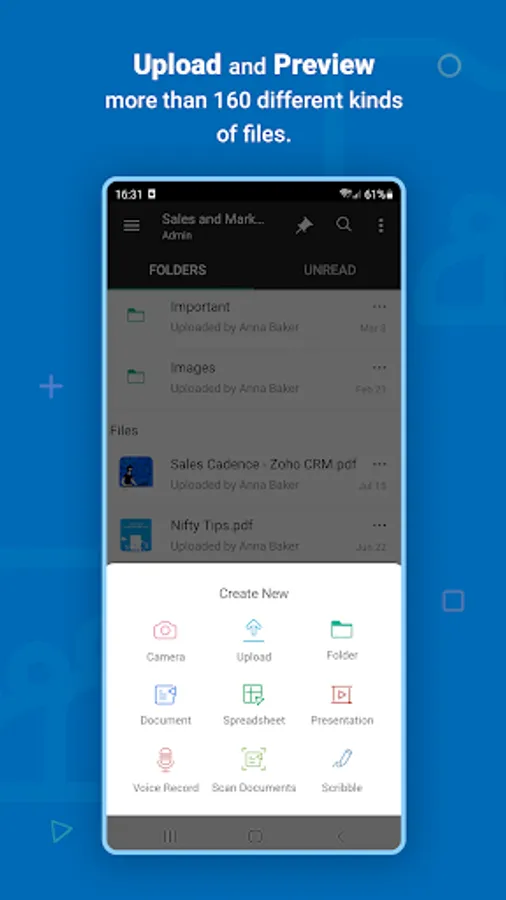 Upload files faster: Upload photos from your mobile, audio recordings and any file from your device or other cloud storage and manage them from a single place using WorkDrive. You can also scan documents to the cloud using your camera, and to digitalize your bills, whiteboard discussions, and notes.