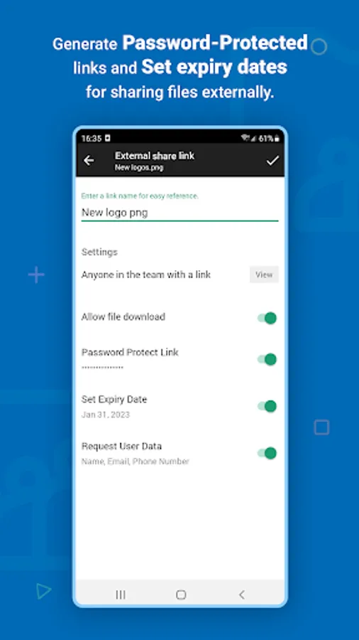 Collaborate with external stakeholders: Create external share links to work with people outside your organization. And you can set a password and an expiry date to the link to ensure secure file access.