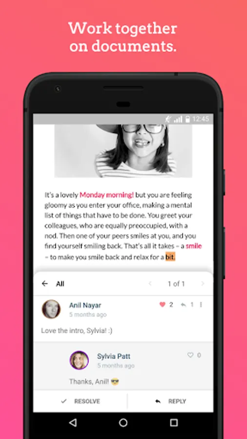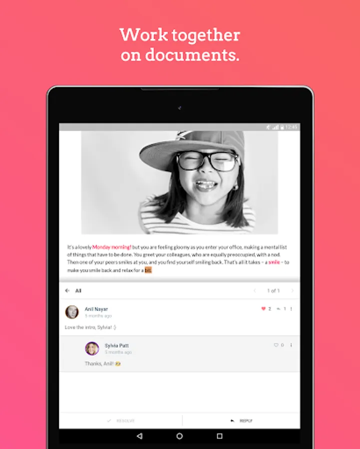 - Join discussions, even when you're away from your desk. Add your thoughts to documents, reply to friends' comments, or just appreciate them by clicking "like." Work together in real-time, with instant sync across your devices.