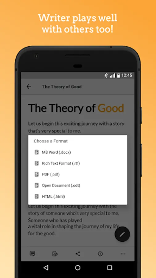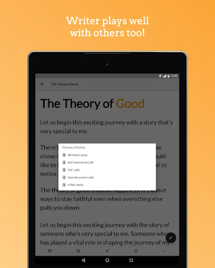 - Open and edit your Microsoft Word documents. Take stories off your world by exporting it as a Microsoft Word document, PDF, ODT, HTML, or TXT.