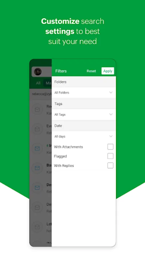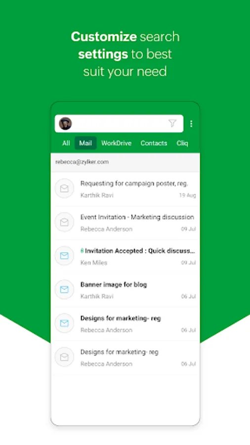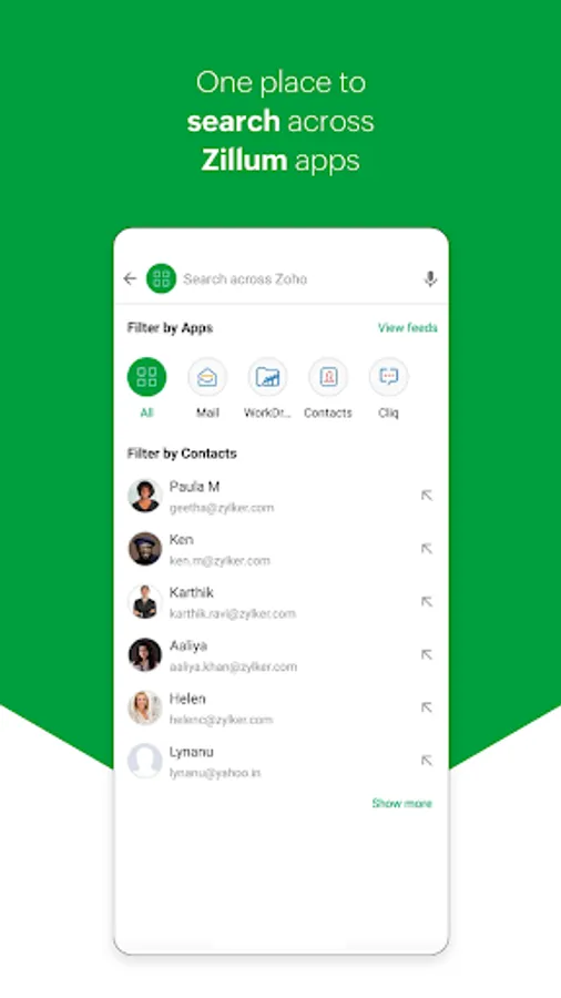The search bar searches for a keyword across all Zillum apps, with results filtered by specific contacts and by individual apps. Find exactly what you're looking for with minimal effort and further narrow down the results with fine filters.