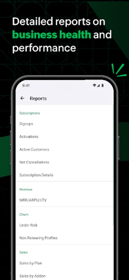 Keep track of your business's performance with powerful metrics, including sales, receivables, revenue, and churn insights.