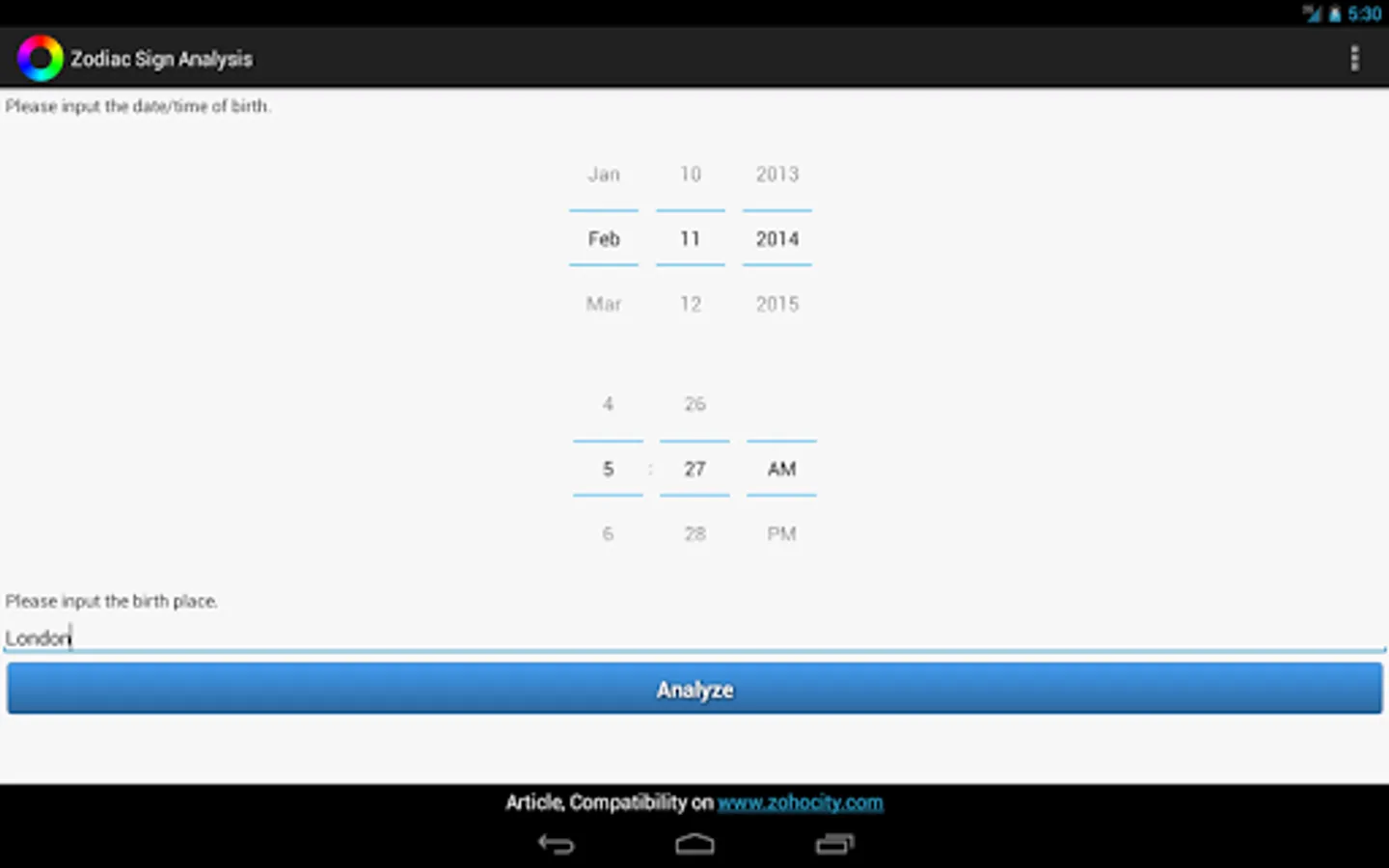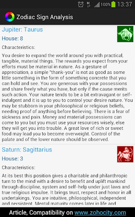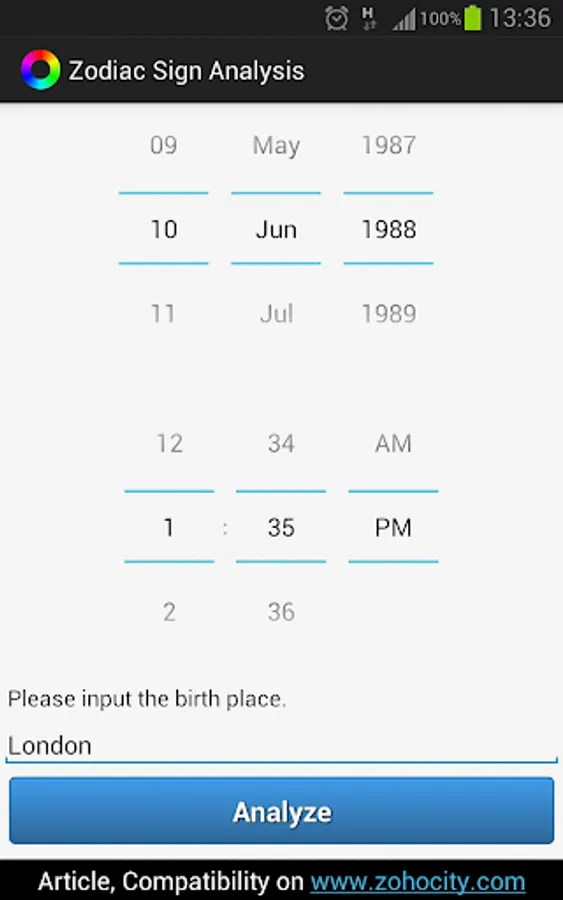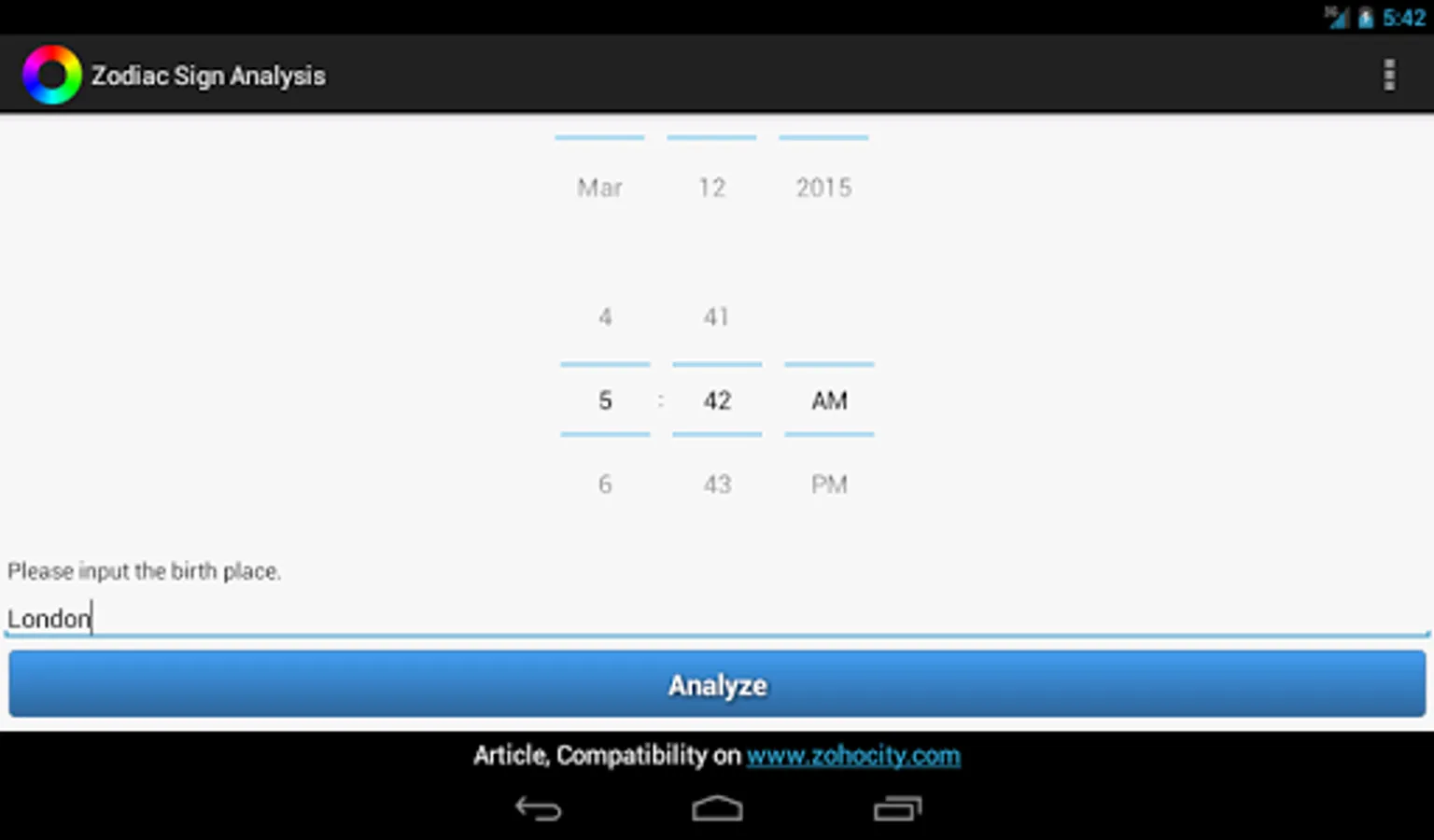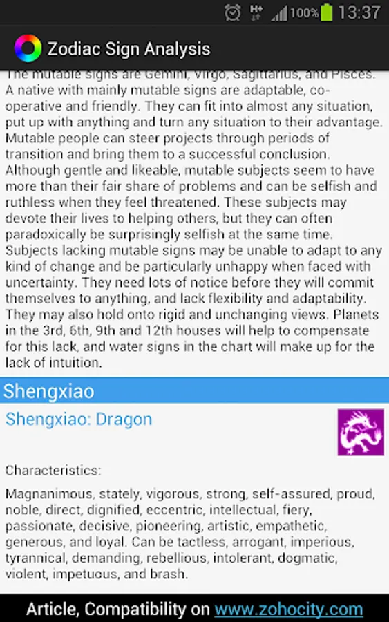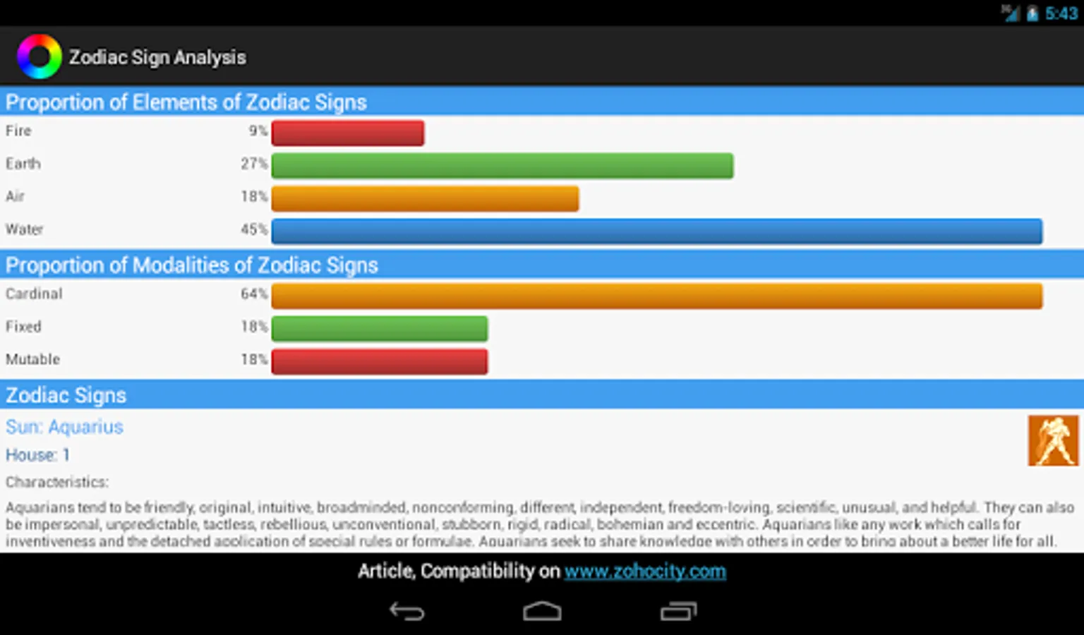 This app analyzes your natal chart (birth chart) and give you a descriptive report of zodiac signs (Sun sign, Moon sign, and Ascendant sign) and their corresponding four elements and three modalities. It also gives you the Shengxiao (Chinese zodiac from Ancient China) .
