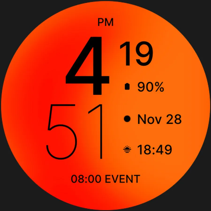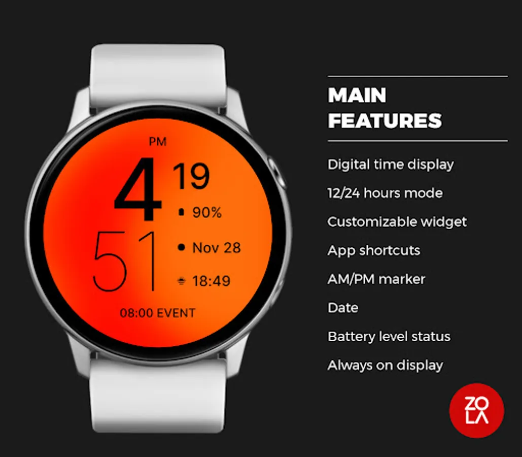 Red Watch Face for Wear OS, modern interactive digital watch face made with minimal design focused on legibility and usability.