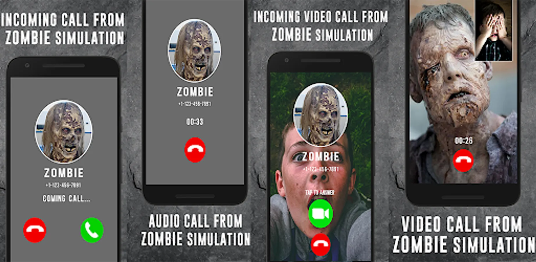 Zombie Fake Call - Video Call From Zombie Prank allows you live the Creepy experience of calling fake call and video scary Zombie and receive a very realistic call and video call from Horror Zombie, and also you can prank friend, family and kids and give them a good scare.