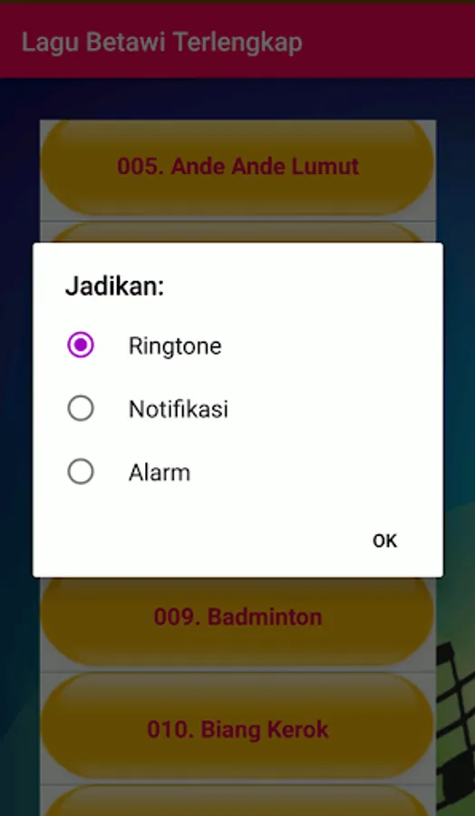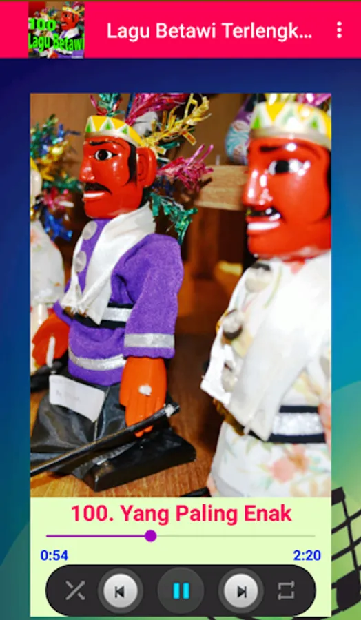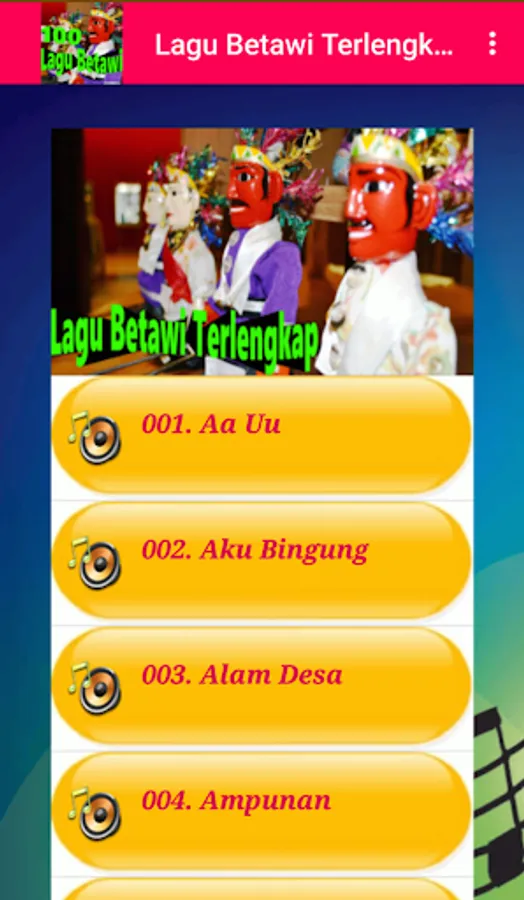Complete Betawi Song contains 100 of the best Betawi songs of all time performed by famous Betawi Artists such as Benjamin S, Ida Royani, etc. Install and enjoy famous and most popular Betawi songs such as Tukang Kredit, Household Problems, Ondel-Ondel, Drizzle Rain, etc. Presented in quality offline audio that can be used as Ringtones, Alarms, and Notifications.
