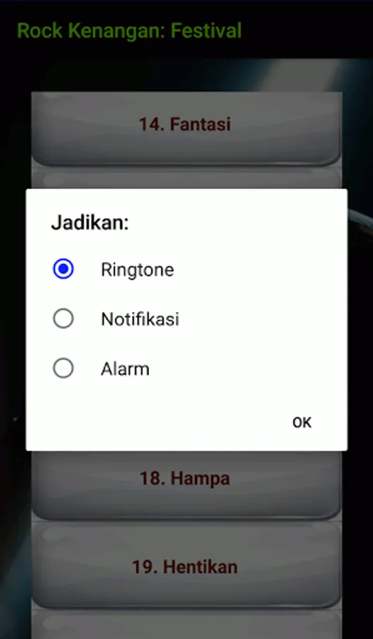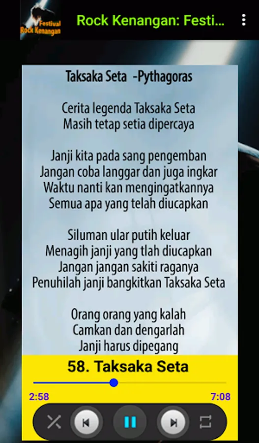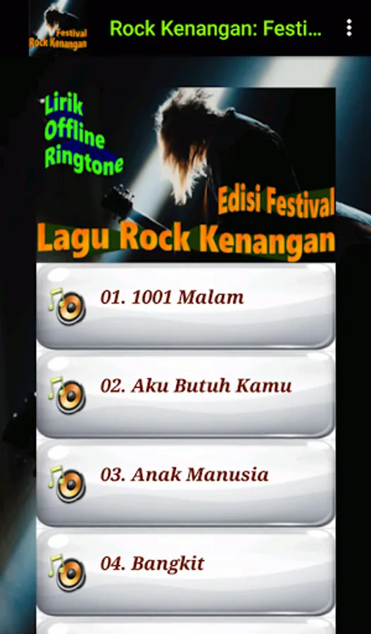 Application of Memories Rock Songs: Festivals containing old school rock songs that have been performed in various rock festivals in Indonesia such as Star Lines, Giant Fortresses, Song of Life, Taksaka Seta, etc. Install and enjoy the ferocious rock music that was presented by the retainer of the Indonesian rock festival champion band. All songs are presented in offline format (no internet connection needed). Also equipped with song lyrics and ringtone functions.