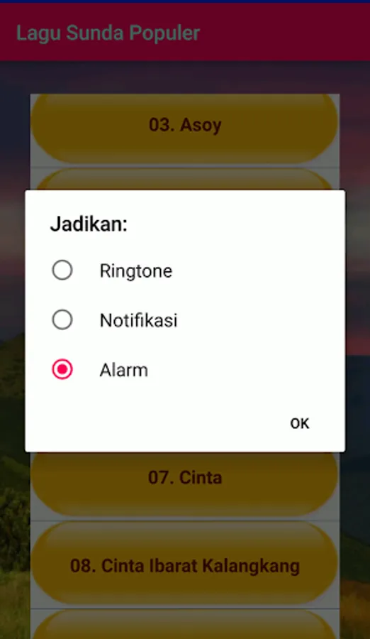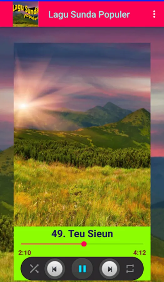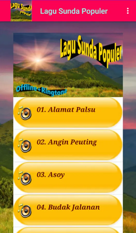 Popular Sundanese Songs application contains Sundanese songs that were popular in his era, such as Wind Peuting, Fried Fried, Kota Kerawang, Nyiap Ka Tikungan, etc. Sundanese song collection that is quite complete includes various genres such as dangdut, Pop, Rock, and degung (traditional). A collection that is very fitting for those fans of Sundanese songs. All Sundanese songs are presented in quality offline audio format. Also equipped with a Ringtone feature.