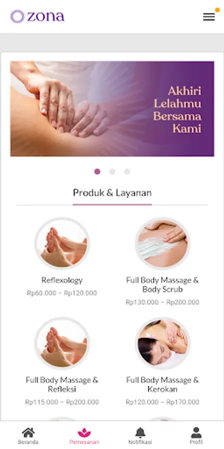 Zona is an online service for ordering reflexology and or full body massage therapists available in almost all parts of Indonesia.