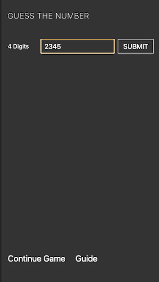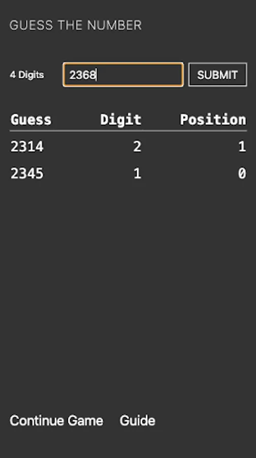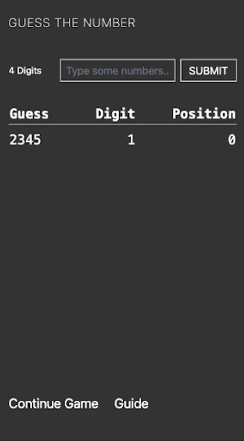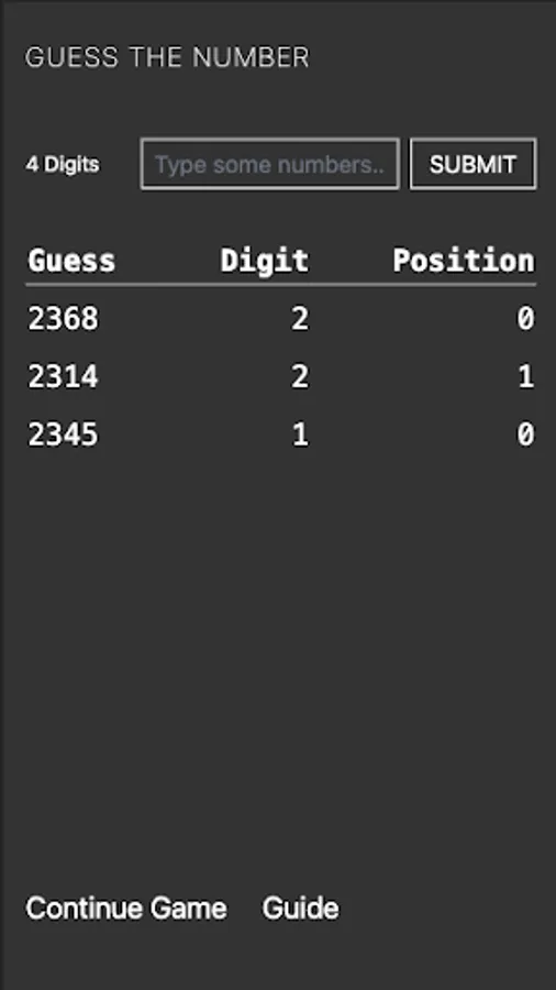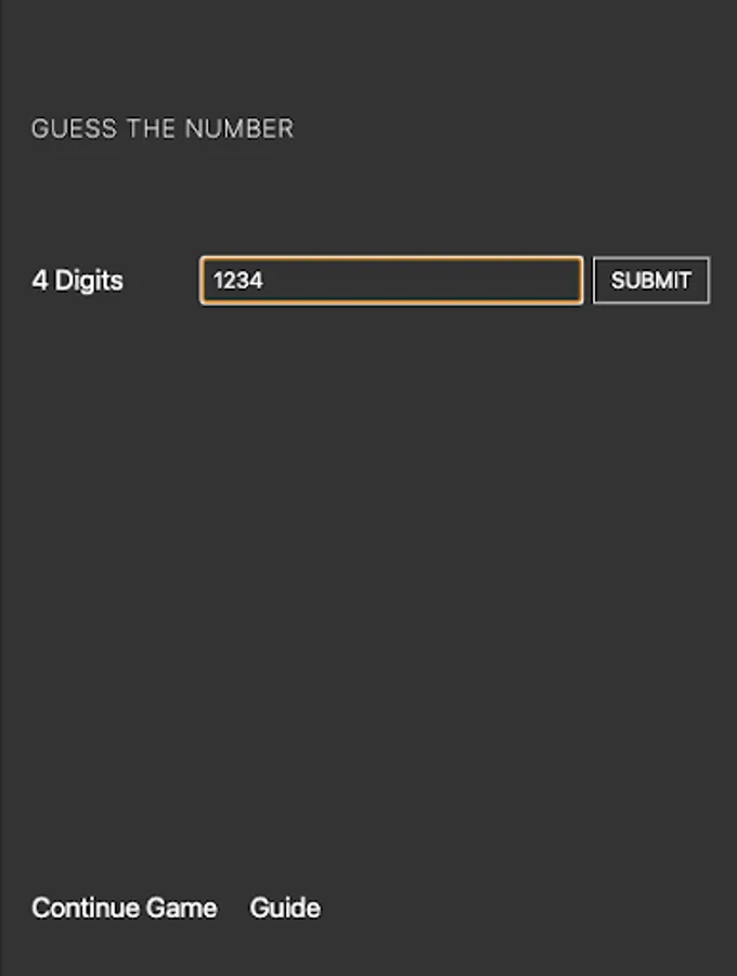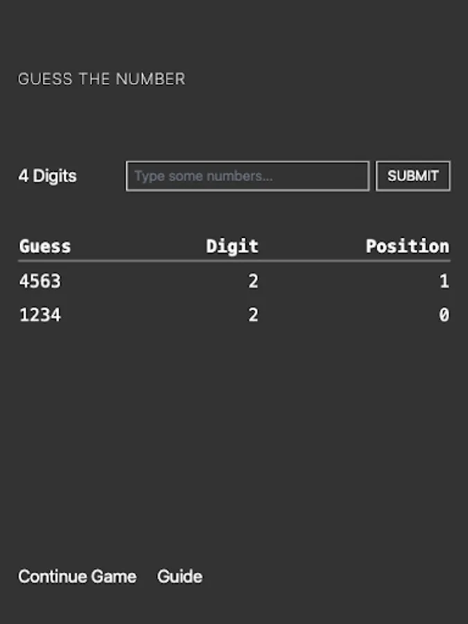 Guess the number is a mind game that will test your ingenuity. It is more difficult than a simple puzzle and you can increase its difficulty even more by adding more digits (the minimum is 4 and the maximum 8).