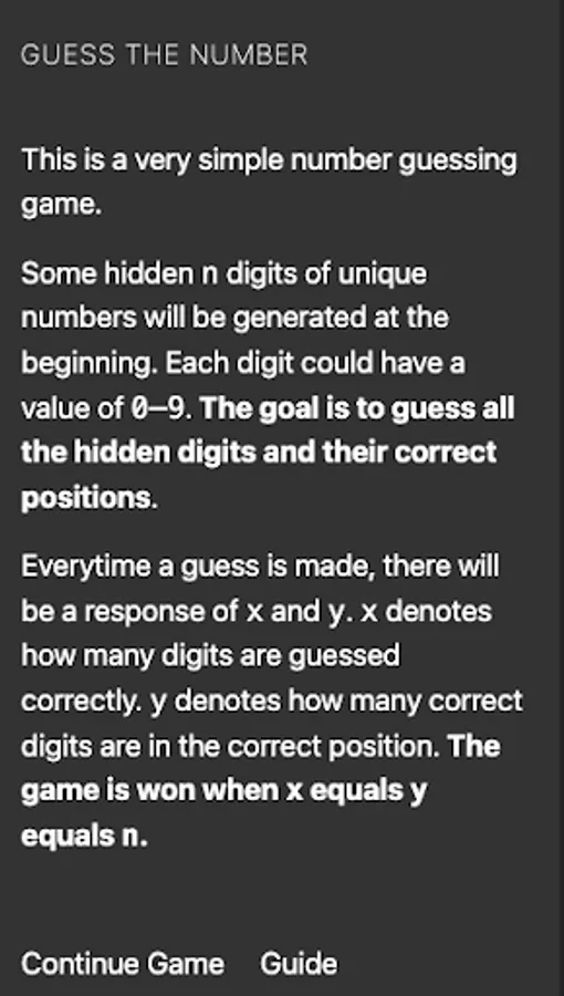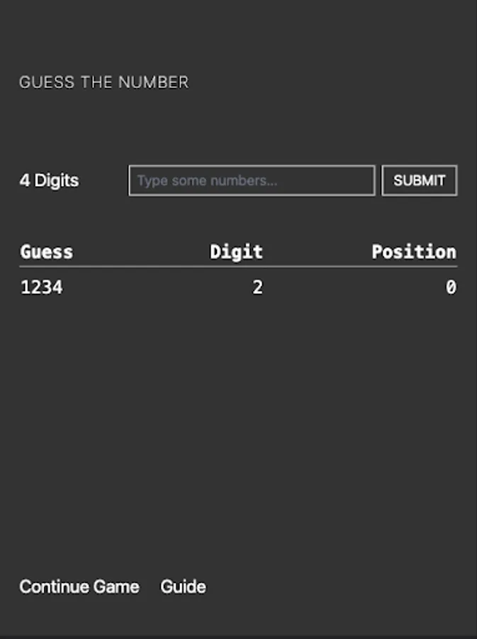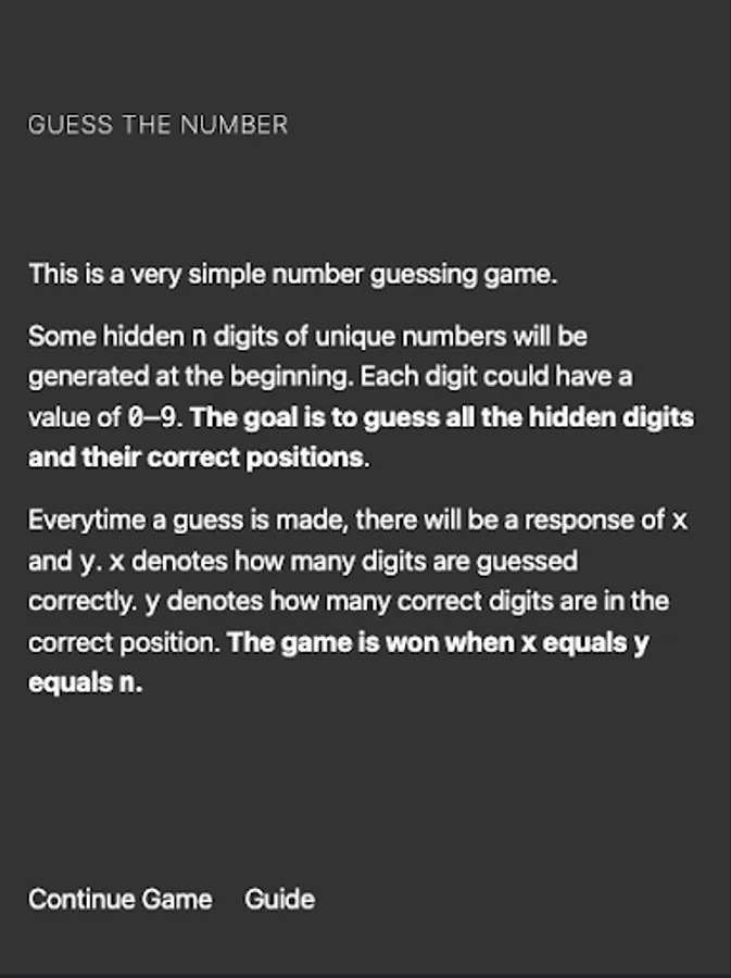 Some hidden n digits of unique numbers will be generated at the beginning. Each digit could have a value of 0-9. The goals is to guess all the hidden digits and their correct positions.