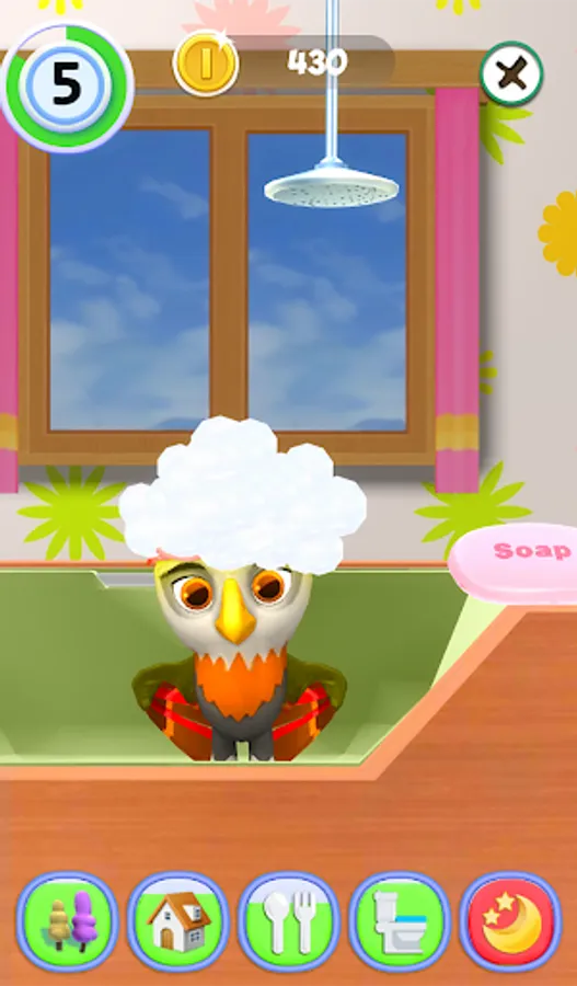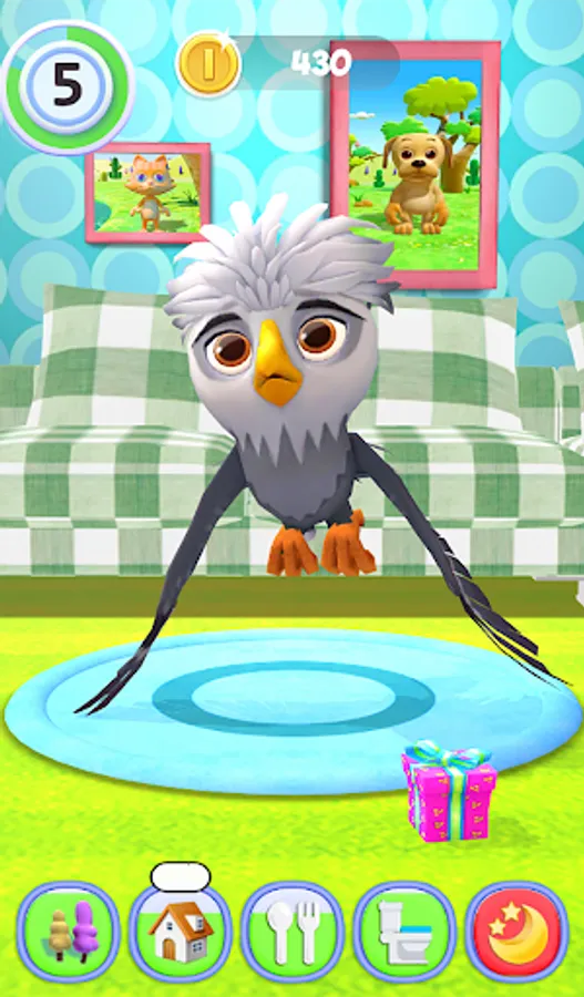 THE MOST BEAUTIFUL ENVIRONMENT:Talking Bird has a living room, a bedroom, a restaurant, a large lawn and a forest.