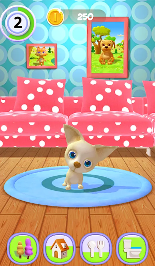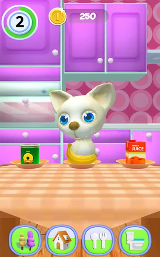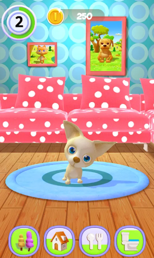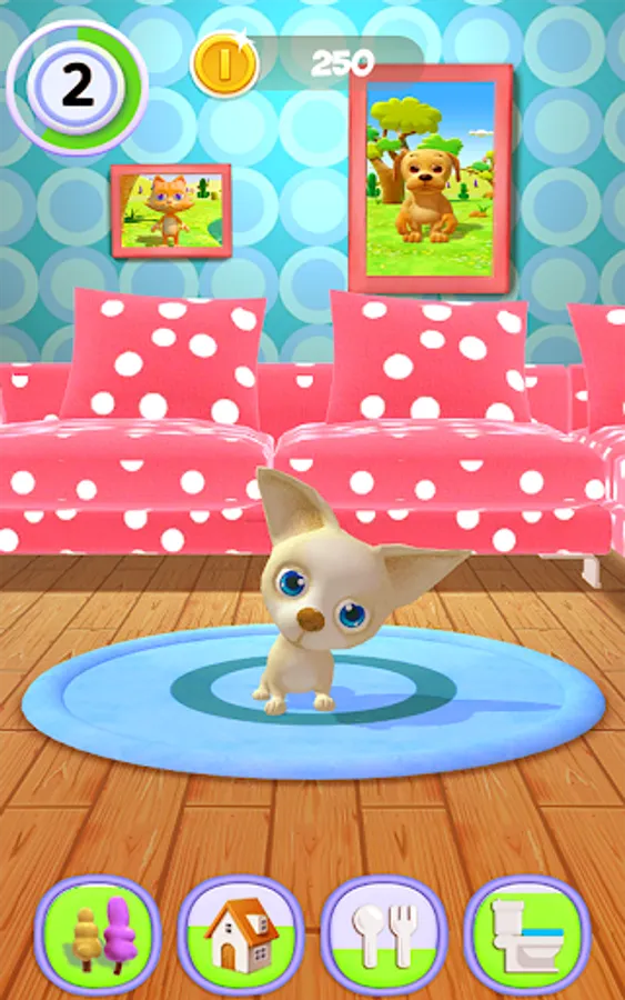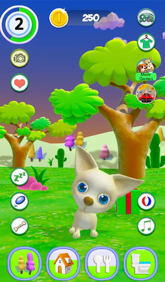 This cute Dog Chihuahua has a living room, a bedroom, a restaurant, a large lawn and a forest. His bathroom is great, where he can brush his teeth and take a bath. Wipe with him with a towel, so that the Dog is more clean and more lovely! We go to his living room, the sofa in front of you will see the lovely little Dog. Play tired, remember to feed Chihuahua Dog to eat, a variety of food choices. There is also a wide outdoor scene where Dog can enjoy a pleasant life.