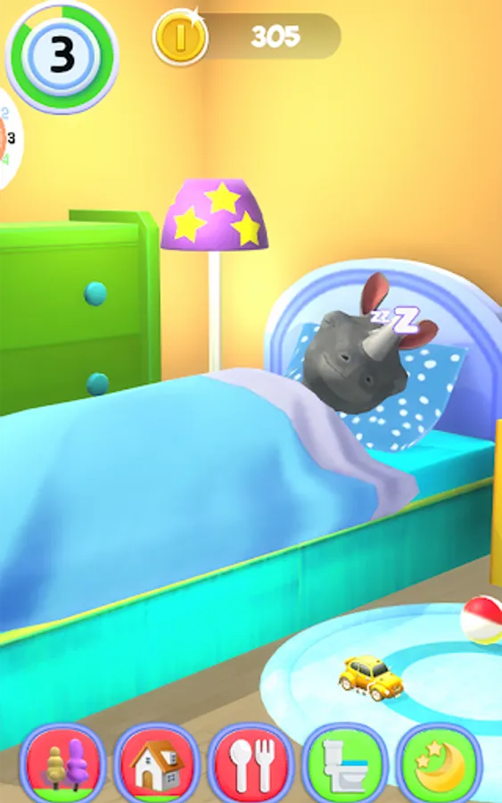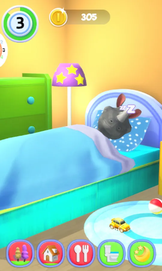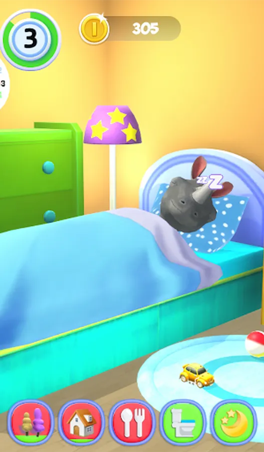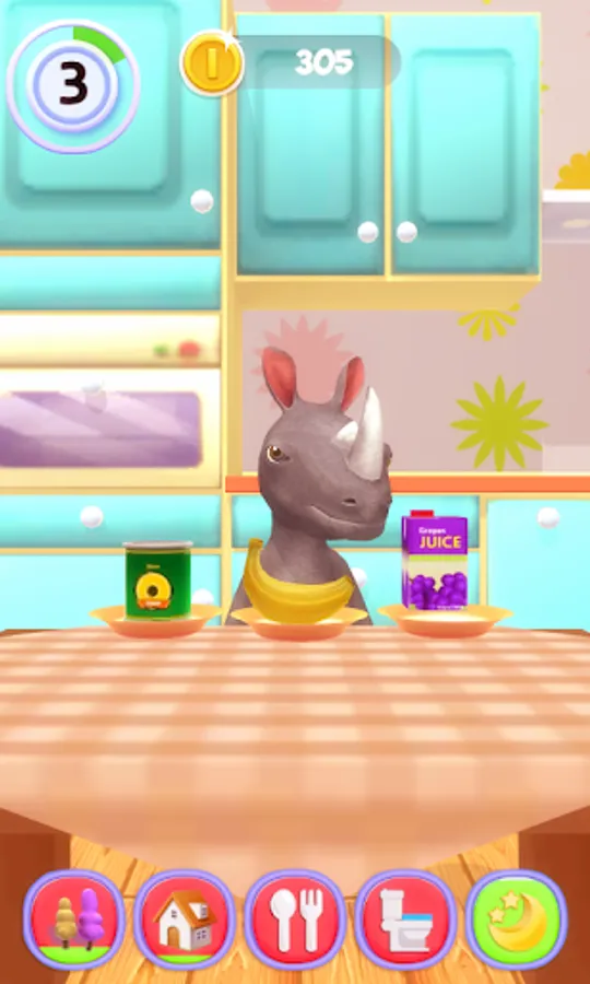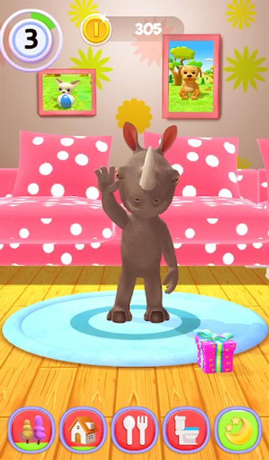 THE MOST BEAUTIFUL ENVIRONMENT:Talking Rhinohas a living room, a bedroom, a restaurant, a large lawn and a forest.