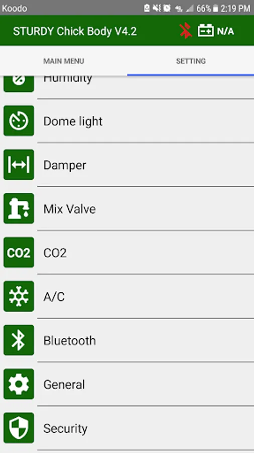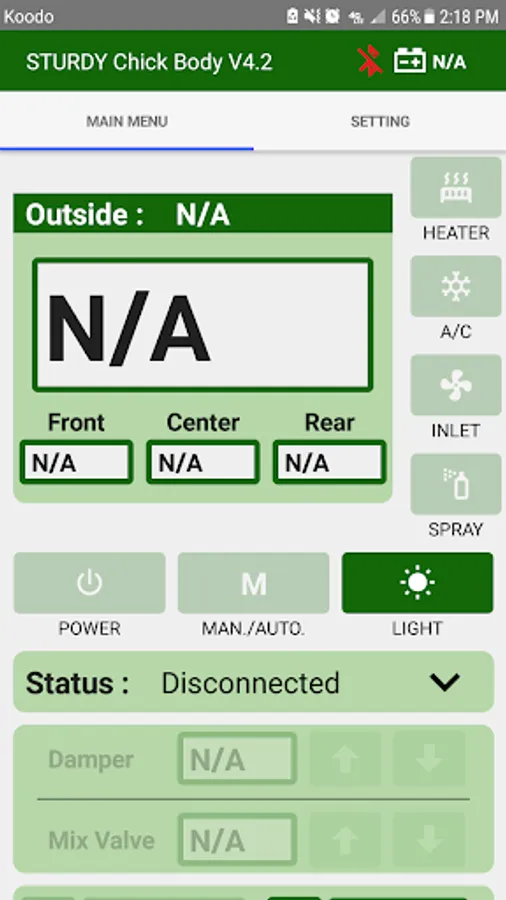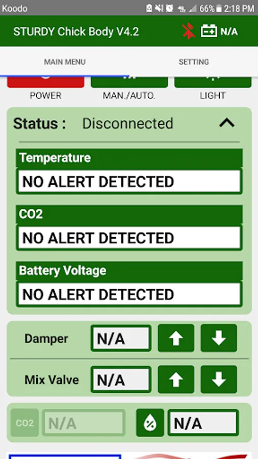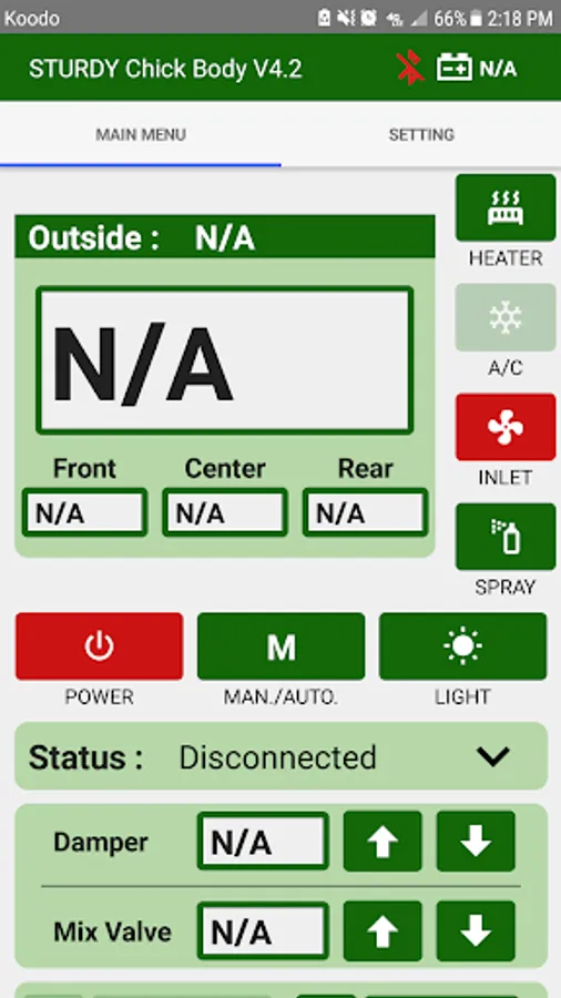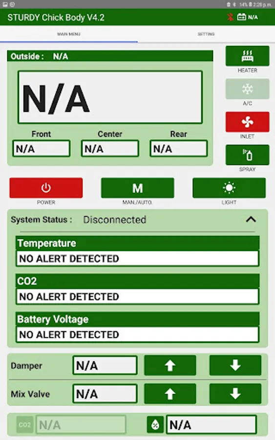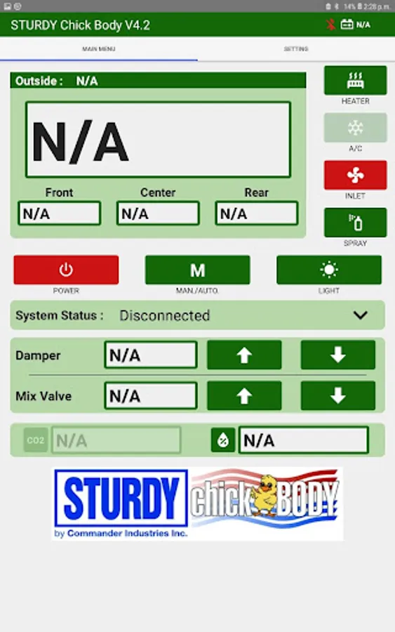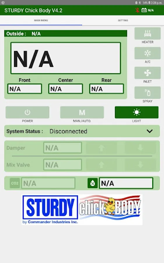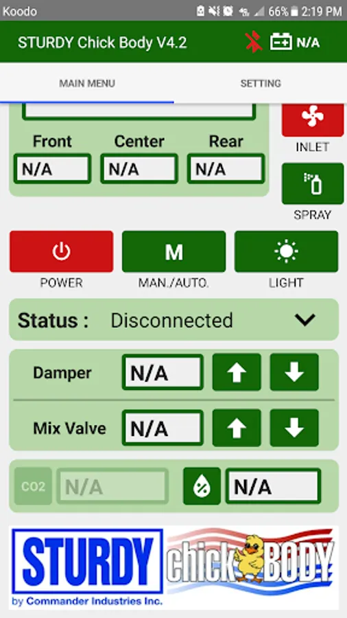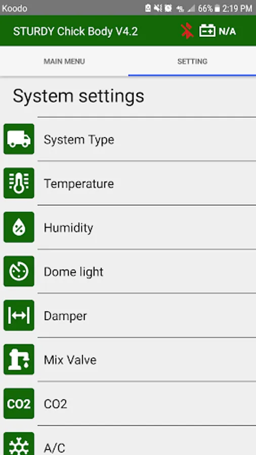 Interface pour système de gestion de transport de poussins permettant le contrôle des ventilateurs, du chauffage et de la climatisation. Les paramètres configurables sont la température, la position des auvents, les niveaux d'alarmes (température, CO2, batterie et humidité) et les délais maximales d'utilisation. Plusieurs paramètres servent aussi à l'optimisation du confort des poussins lors du transport.