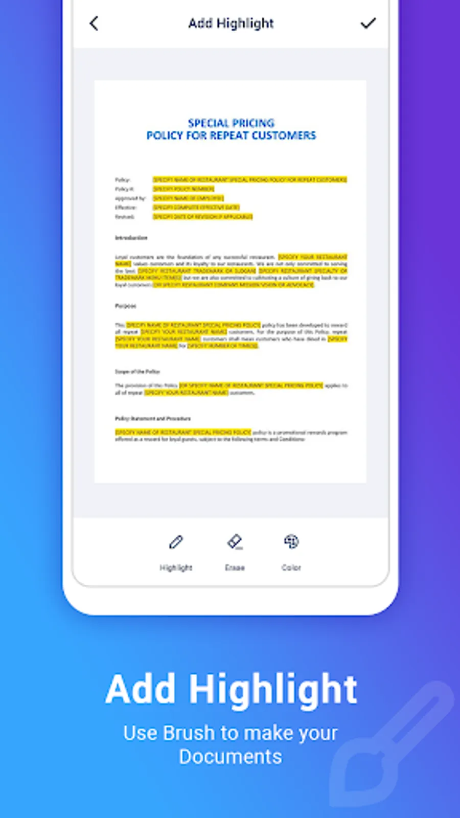 OCR (optical character recognition) feature extracts texts from a single page for further editing or sharing. (Paid app only)