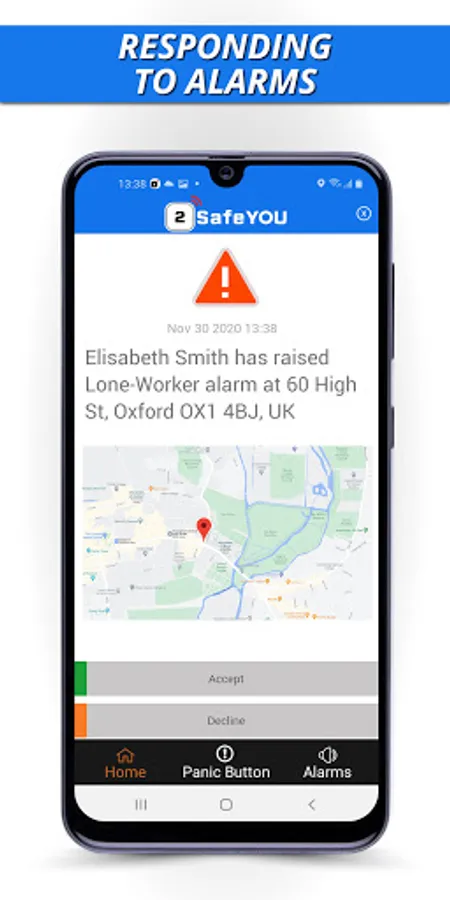 The 2SafeYOU App can be used to handle alarms being dispatched from the server-based software solution. Alarms are pushed from the 2SafeYOU cloud-based server software solution to the App so assigned users can handle alarms. This includes the ability to accept, decline or cancel alarms while at the same time informing all other users in real-time about the alarm handling status.