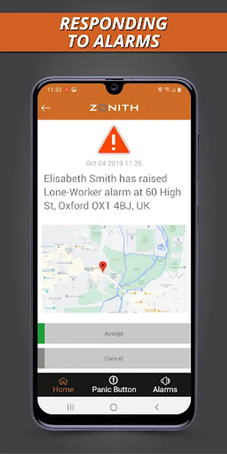 The ZONITH App can be used to handle alarms being dispatched from the server-based software solution. Alarms are pushed from the ZONITH server software solution to the App so assigned users can handle alarms. This includes the ability to accept, decline or cancel alarms while at the same time informing all other users in real-time about the alarm handling status.