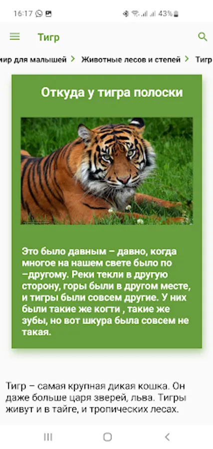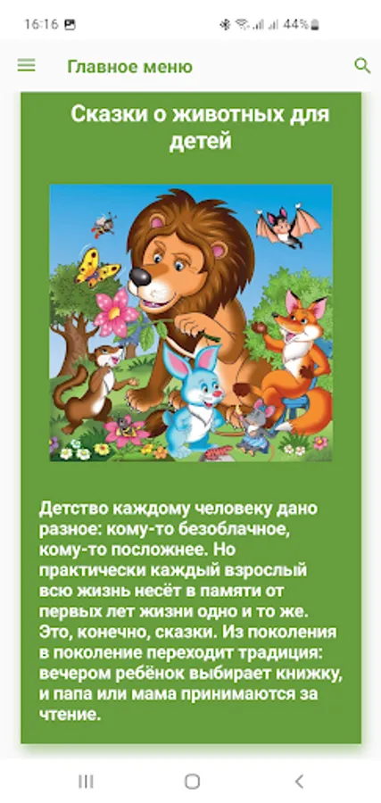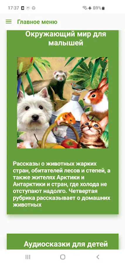 Who does not love poems and fairy tales about animals! Here they are presented very widely - both author's and folk. Here you can learn a lot about breeds, conditions of detention. The Animals for Children application is not just materials in a certain selection, it is like a script specially built for the younger generation to have a lively dialogue with the surrounding nature, full of reflections, generalizations, comparisons of various situations. This is the very platform where the child can make his first discoveries!