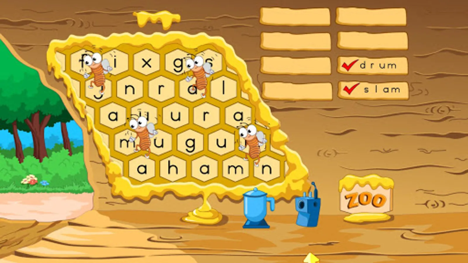 Zeke Zebra will give him or her a start by giving him or her the word’s first letter sound. Or the child can be a super-sleuth and find the words on his or her own. The Walkie-Talkie is always available for a hint – just click on it! The initial letter will flash and go pink! The child will tap on the three letters that make the word, and the cells of the honey-hive will turn yellow if correct (and make a musical sound).