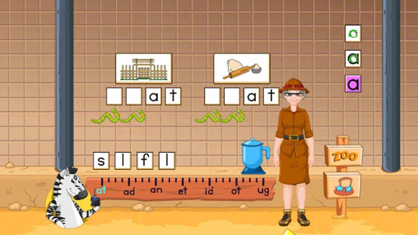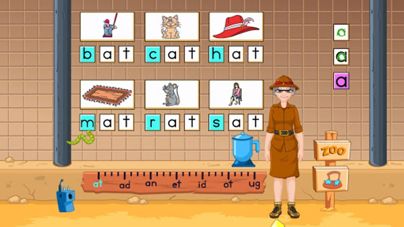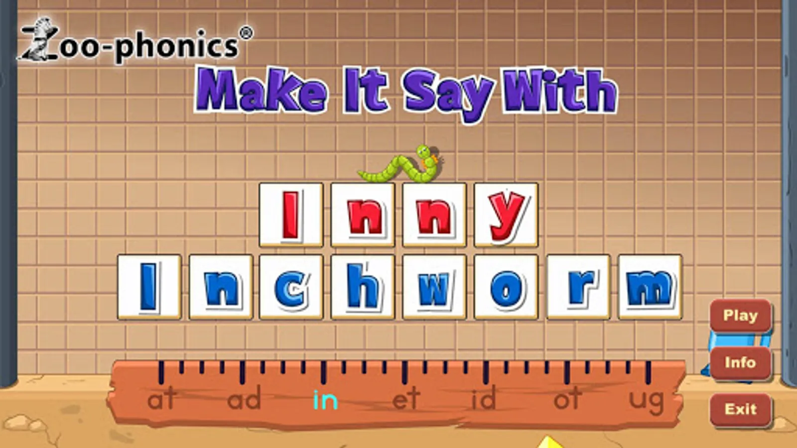 Select different word families by clicking on the word families on the ruler at the bottom of the screen. Zoophonia will tell the child which word family she or he has chosen, and will Signal and sound it. Encourage the child to watch Zoophonia carefully and try to Signal and sound with her. Inny Inchworm and Zoophonia will help the child “make it say…” (spell) the word that she or he sees in pictures.