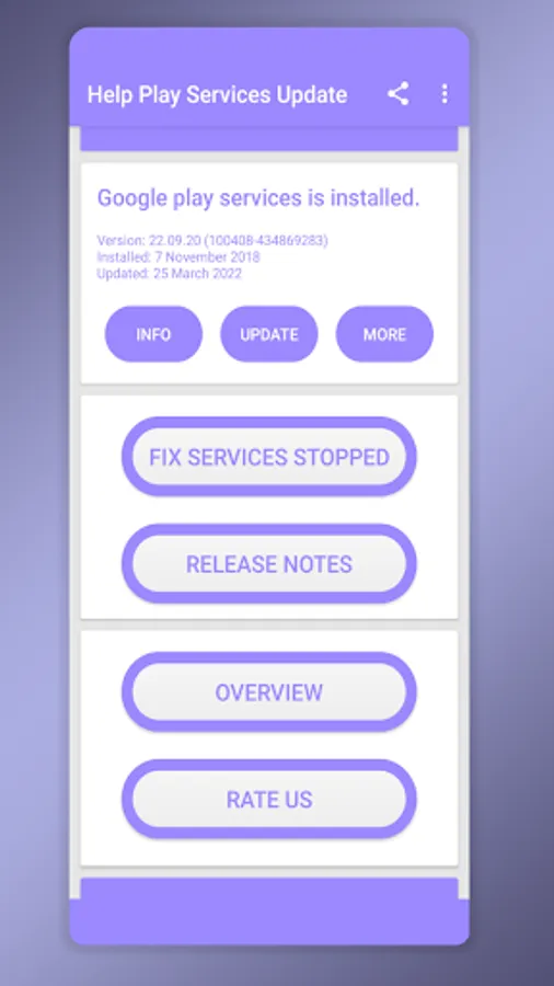 Play Services info Update app helps to quickly check the status of the Google Play services. It shows the version number, installation date and date of the last update. It also provides links to the Play Store, developer release notes, and the app info dialog.