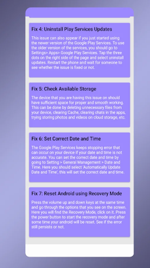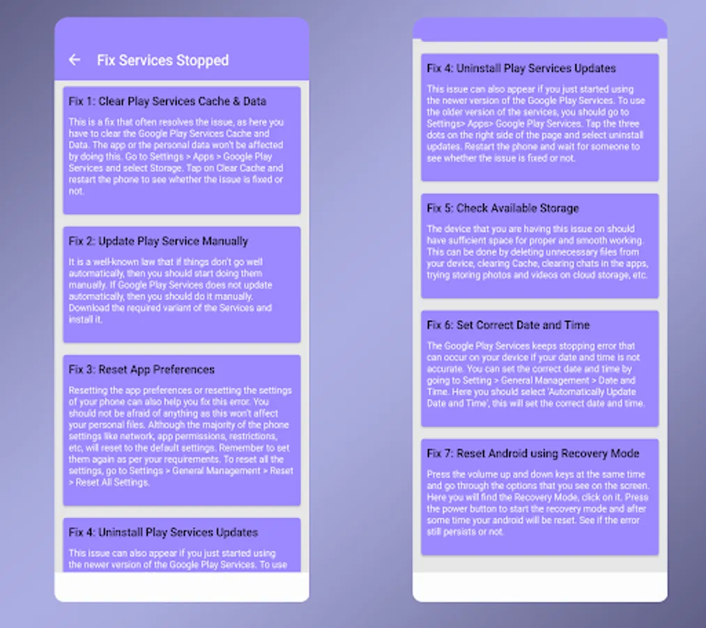 To fix "Google Play Services has stopped" errors, try opening the app info dialog and select "clear cache". If that does not work, try the "uninstall updates" option. Then download and re-install the latest version of the Google Play services using the Play Store link. In the new "More" view you can also check the status of the Google Play Store, Instant Apps, Google Services Framework, and Google Account Manager.