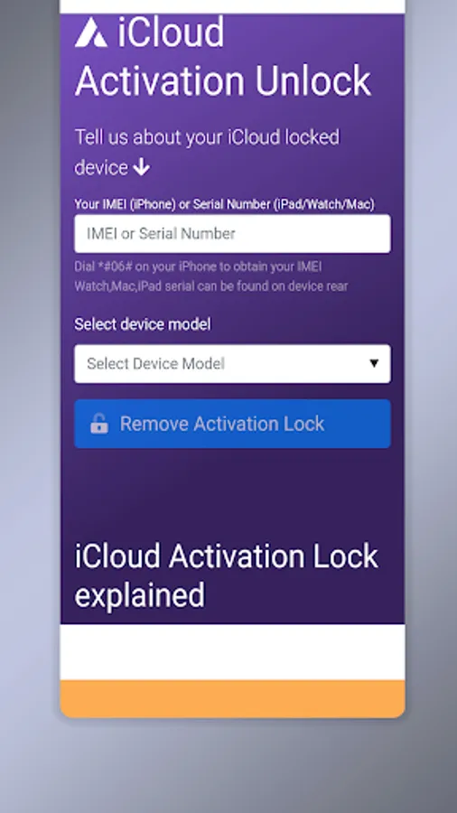 Icloud unlock app is android application which help you to check iphone imei number, icloud activation lock removal & device unlock. Also this 'icloud and iphone unlock' app help you to remove icloud activation lock & unlock your iphone, ipad or ipod or Apple Watch fast and secure.