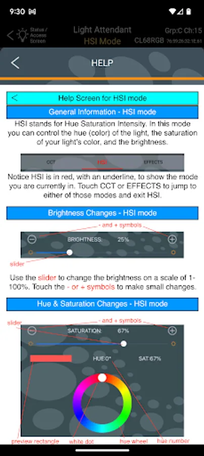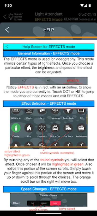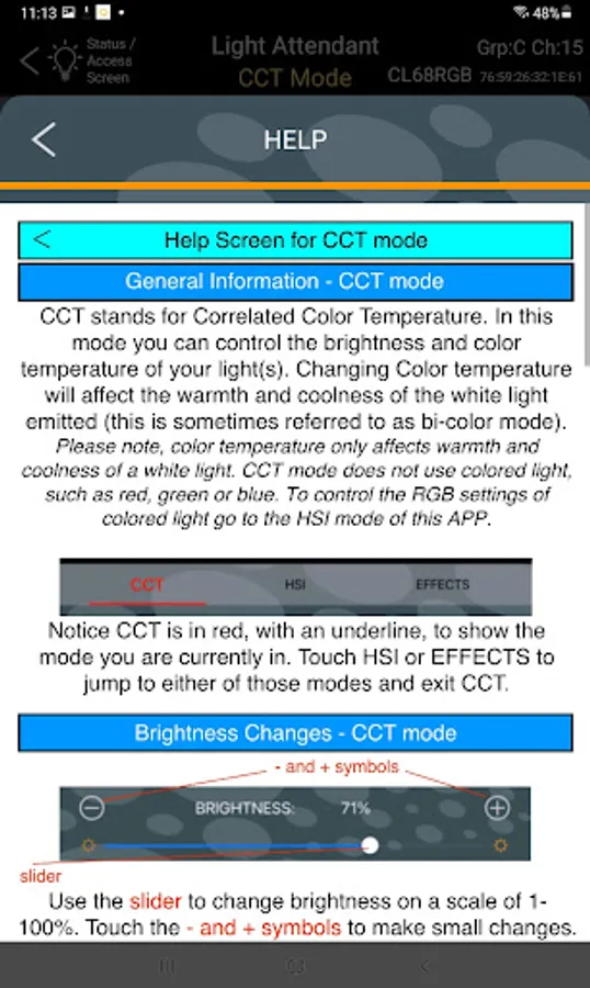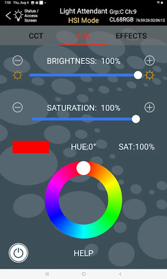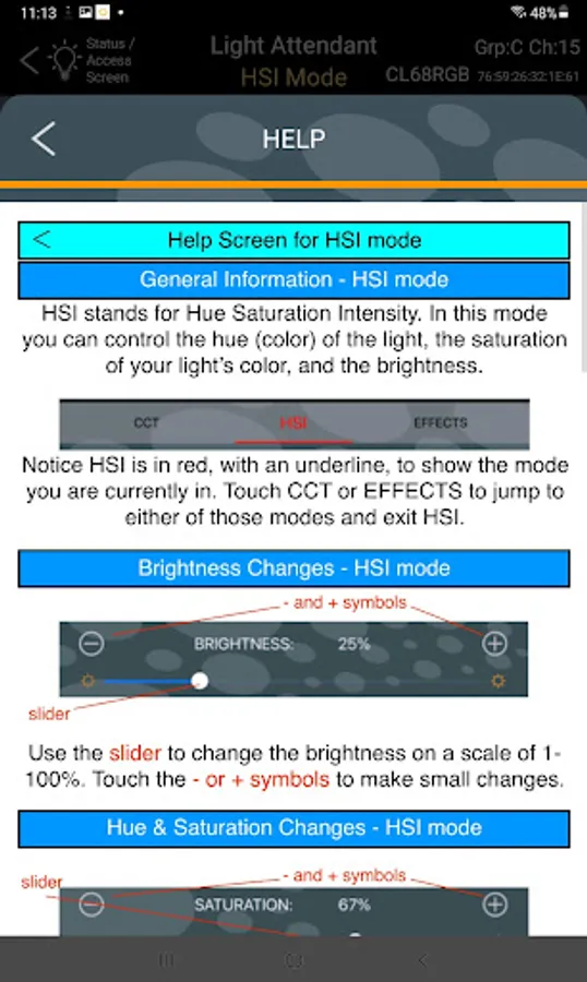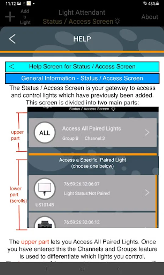 While Light Attendant has been designed for intuitive use, help screens are also available within the app, and can be accessed at any time for further instruction. Simply touch the HELP button at the bottom of any screen to receive full instructions regarding the use of that particular screen in the app.