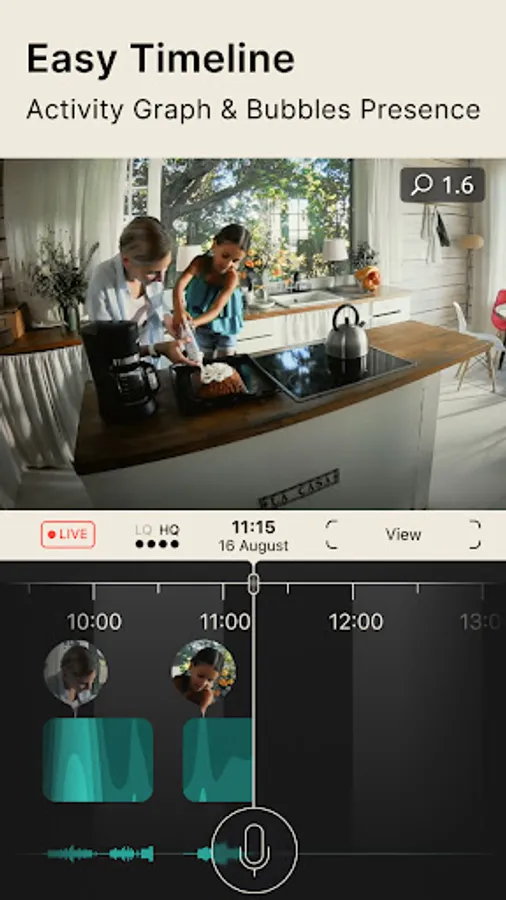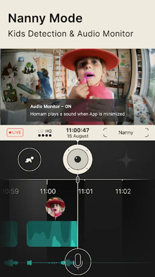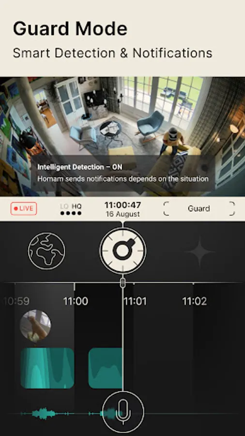 Easy to set up, simple to use. Pairing happens unnoticed when you bring your phone close to Homam. All complicated video analytics is hidden under the Timeline with AI Bubbles and Activity Graphs. Modes allow switching your Homam from Nanny to Guard scenario on a tap, where you can use Sensitive Detection, Security Notifications, Geo-location, etc.