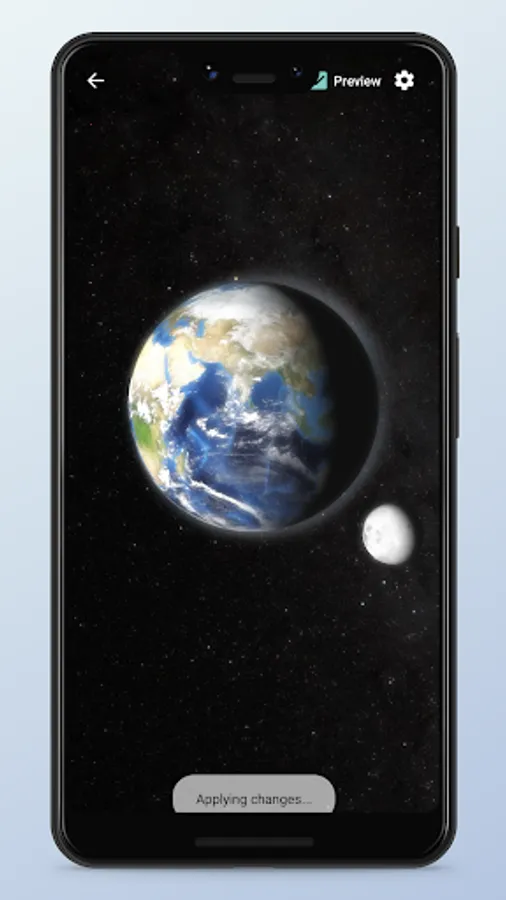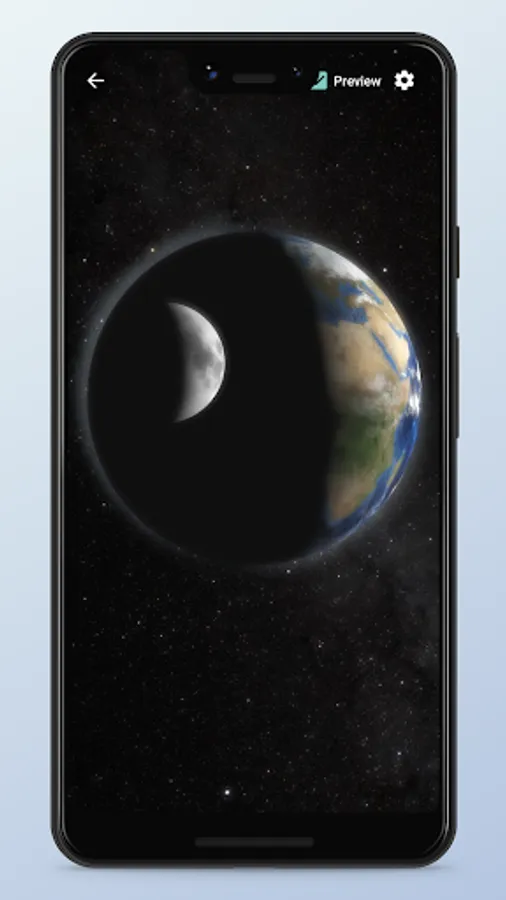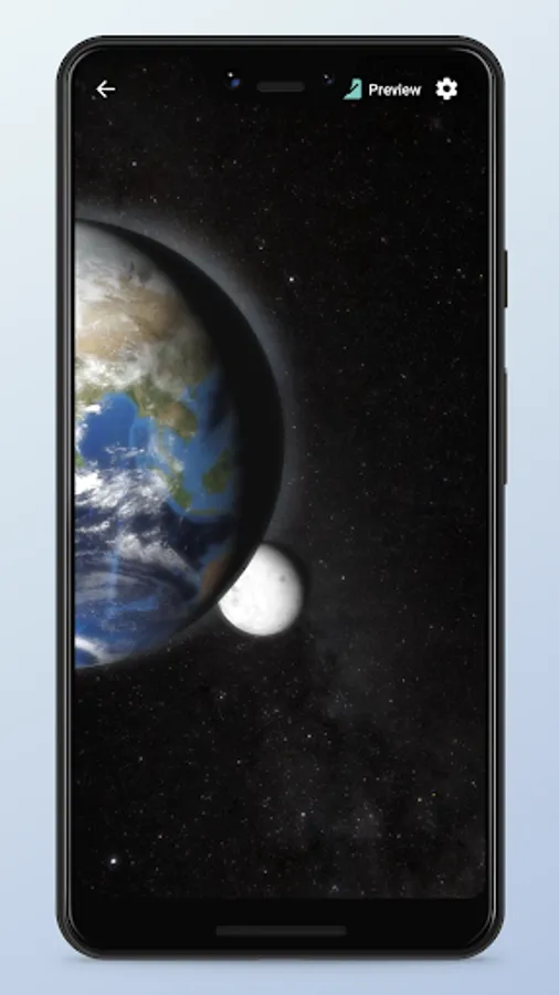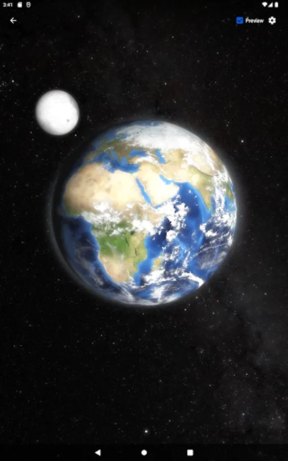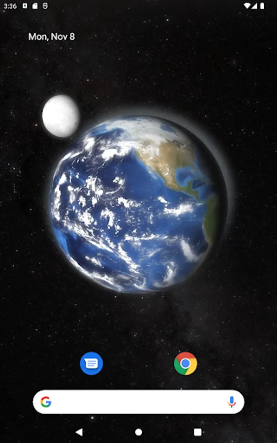 This 3D live wallpaper uses latest engine and technology to create stunning, live space. It uses highest quality textures for rendering earth, moon, space, and in addition with different animations, light rotation, particle creations and bloom effects produces unreal views.