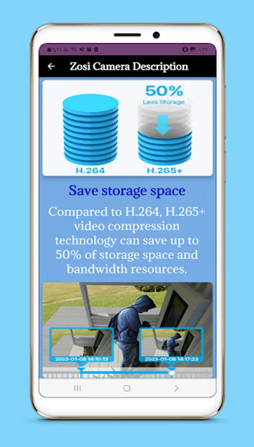 With the advanced H. 265 technology, which could double the data compression ratio, keep the high quality video even with low bit-rate, Zosi Camera Guide allows you to maximize storage space and enjoy ultra-long recording.