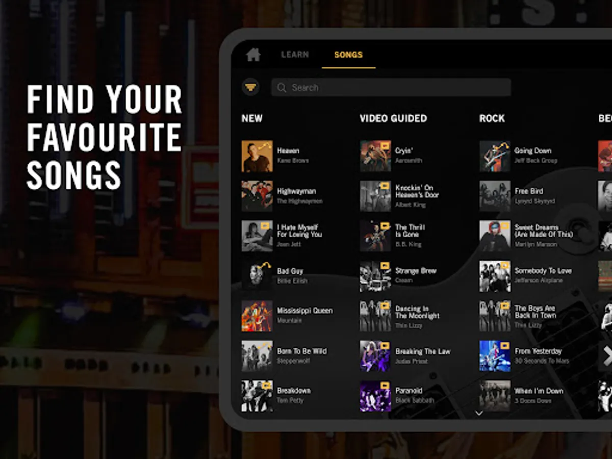 100s OF FAMOUS SONGS: Our guitar song catalogue includes songs by Eric Clapton, B.B. King, Santana, Aerosmith, Tom Petty, Dolly Parton, The Beatles, Lynyrd Skynyrd, and many more. Find your favorite guitar band. We regularly add new guitar songs.