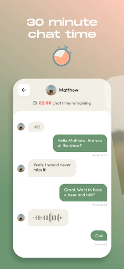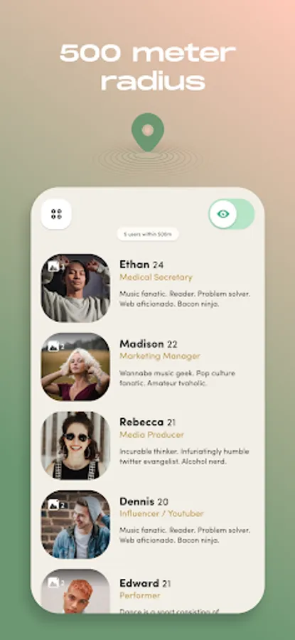Zown only lets you see the people that are within a 500m radius from you so you can meet instantly. Once you connect with someone you only have 30 minutes of chat time in order to arrange a meeting point and meet in real life to maintain the connection. We want you to use this app as little as possible and go out there in real life as much as possible.