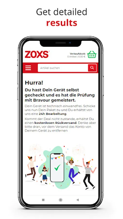 You have just offered your used smartphone or tablet on www.ZOXS.de and created a sales order. Now you can easily check the functionality of your device with the help of ZOXS CHECK. All you need is your device and your personal access code, which you have already received by e-mail or seen on the website. Perform a few short tests with ZOXS CHECK and test the touchscreen function, the speaker, the camera, the battery performance and much more. The test via ZOXS CHECK takes only 3-5 minutes. Afterwards, you will receive a detailed overview of the test results.