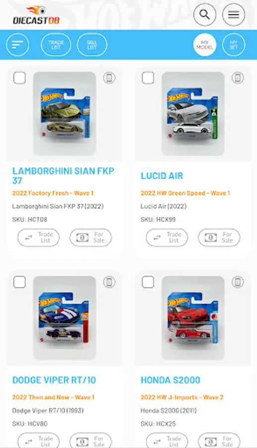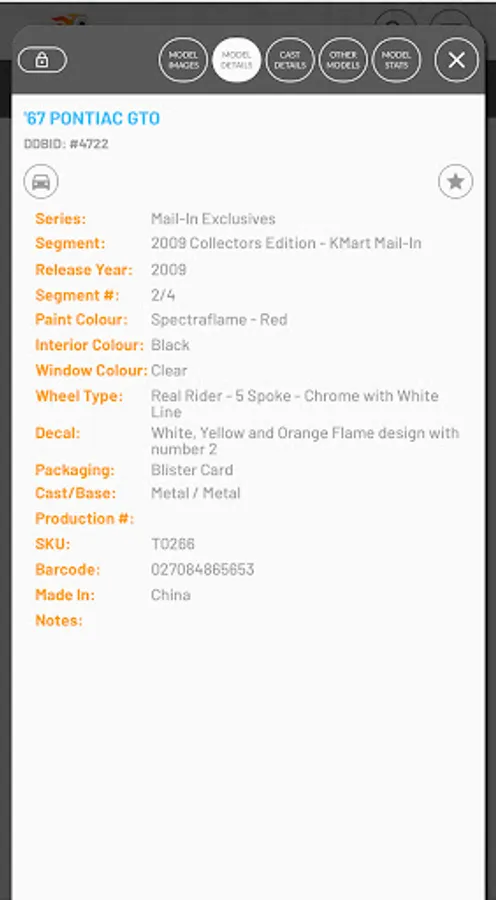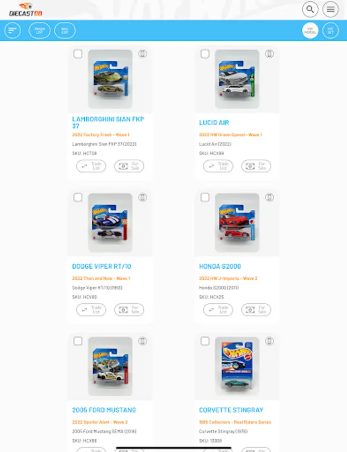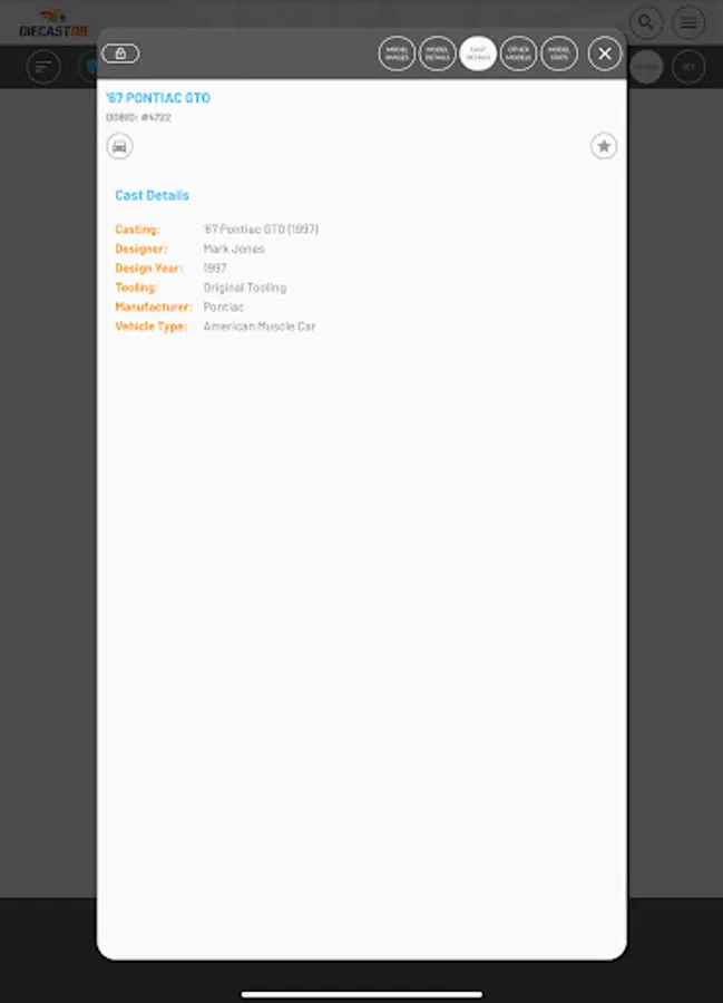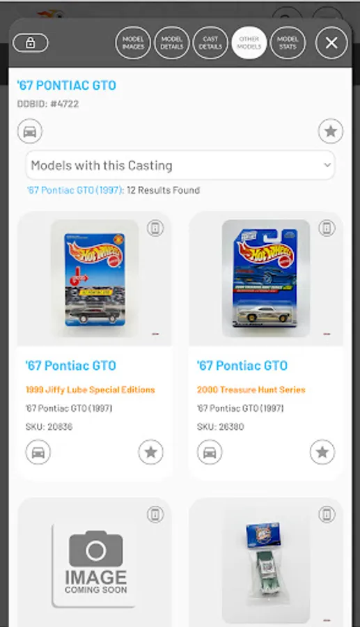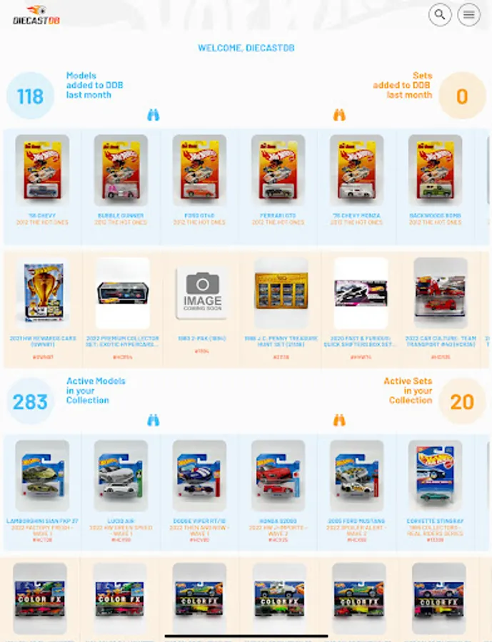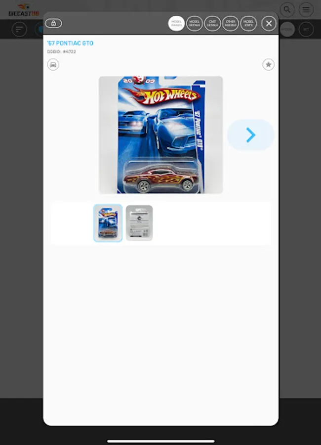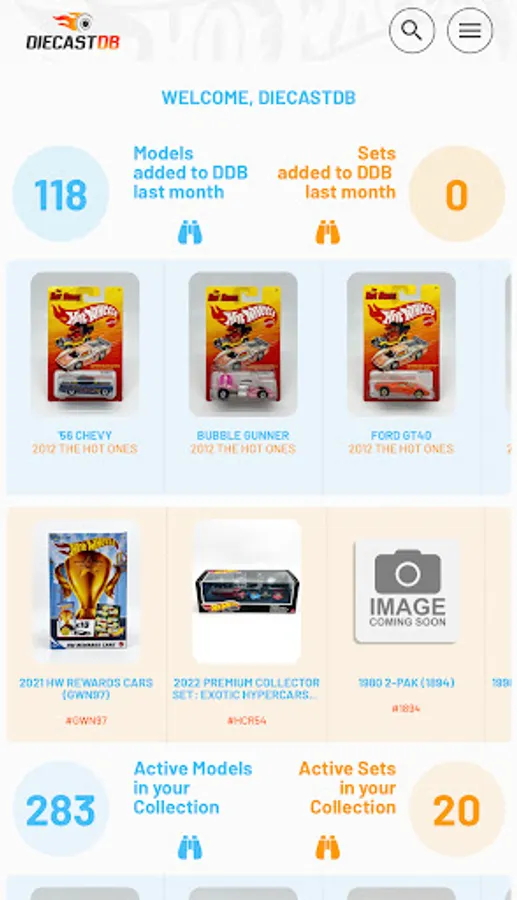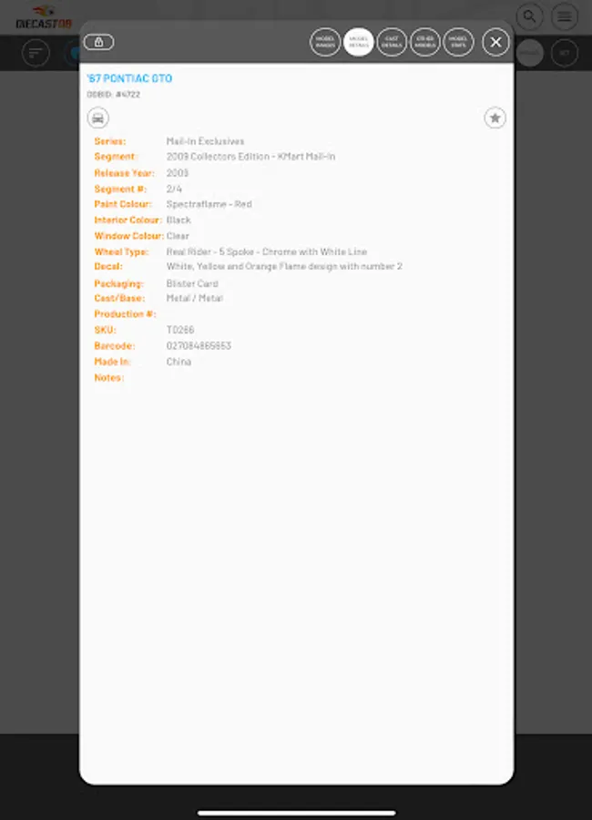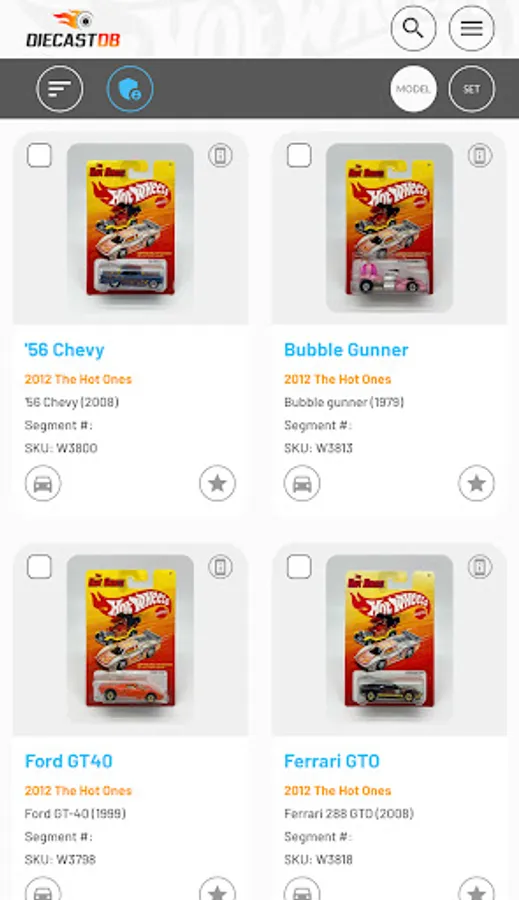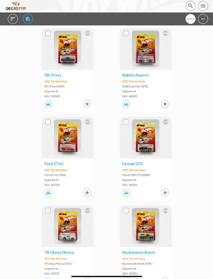Search and manage your Diecast collection on the move. Thousands of Hot Wheels, Matchbox and many other brands already added to a fast growing database. All database models are first researched and verified before being added to the database, ensuring you have access to the highest quality data. If your model is not in our database, you can add your own and when we have been able to add it to our database, it will sync with your model and populate any missing information.