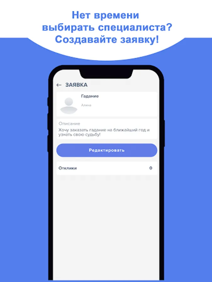 Если вам не хватает времени на поиск подходящего специалиста, вы можете создать заявку на консультацию, указать интересующее направление, описать свой вопрос и выбрать специалиста из тех, кто откликнулся на вашу заявку. Удобные уведомления с возможностью отключения будут напоминать вам о новых откликах. Обсудите все детали и договоритесь о встрече в чате.