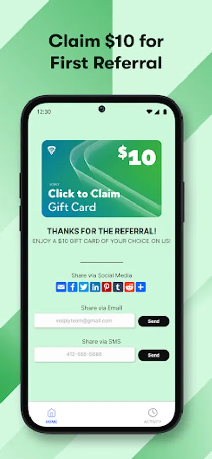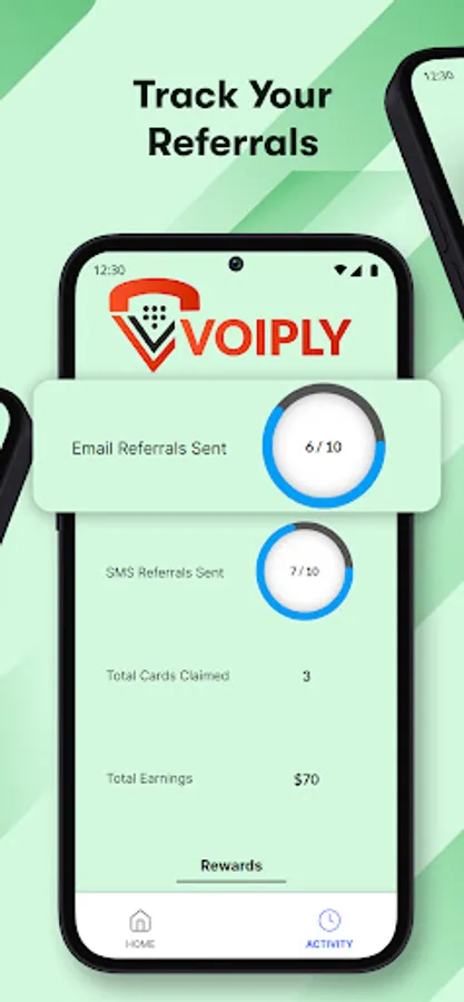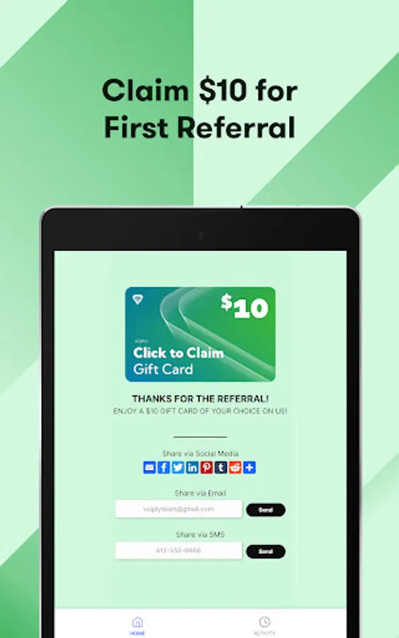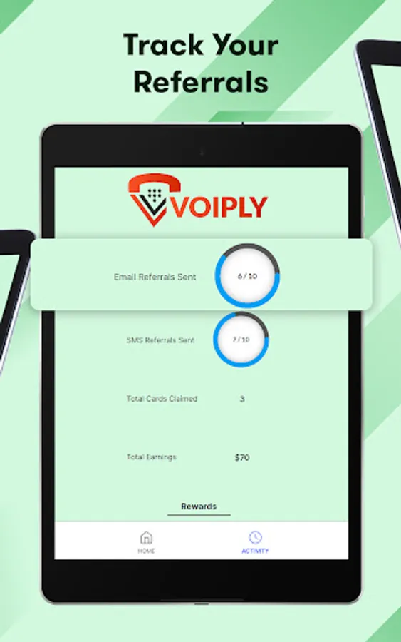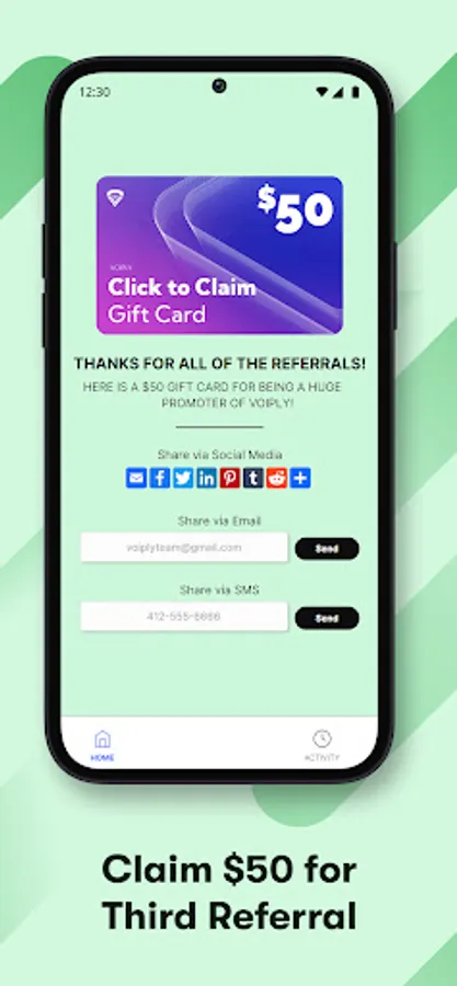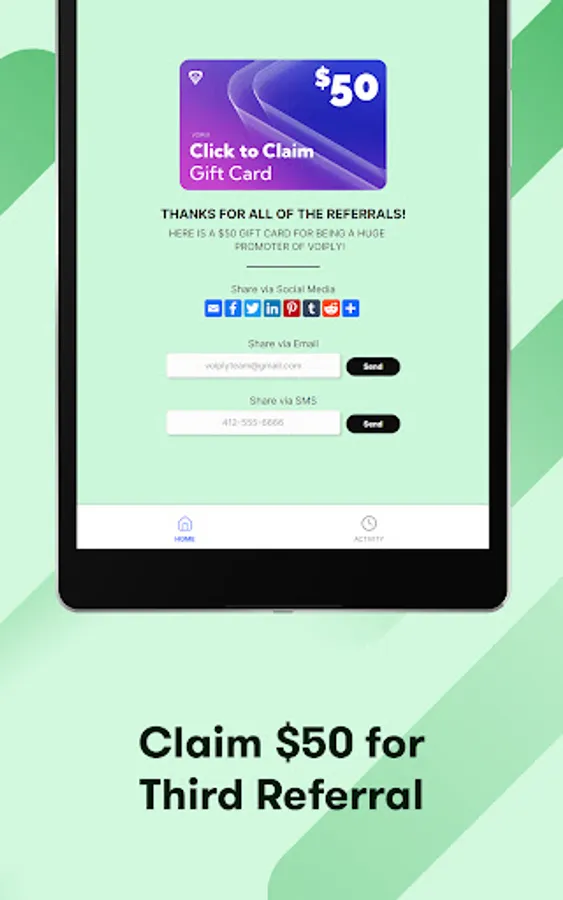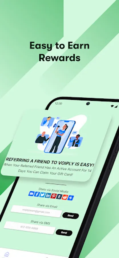 Voiply residential customers have access to an amazing reward program. Use the app to send emails and SMS messages to contacts. By referring friends and family to Voiply customers can earn up to $70 in gift cards.