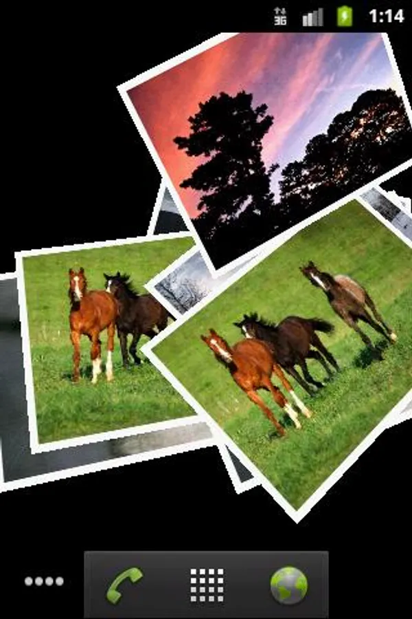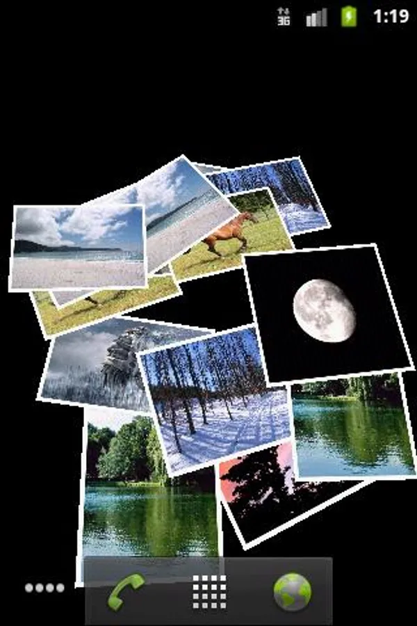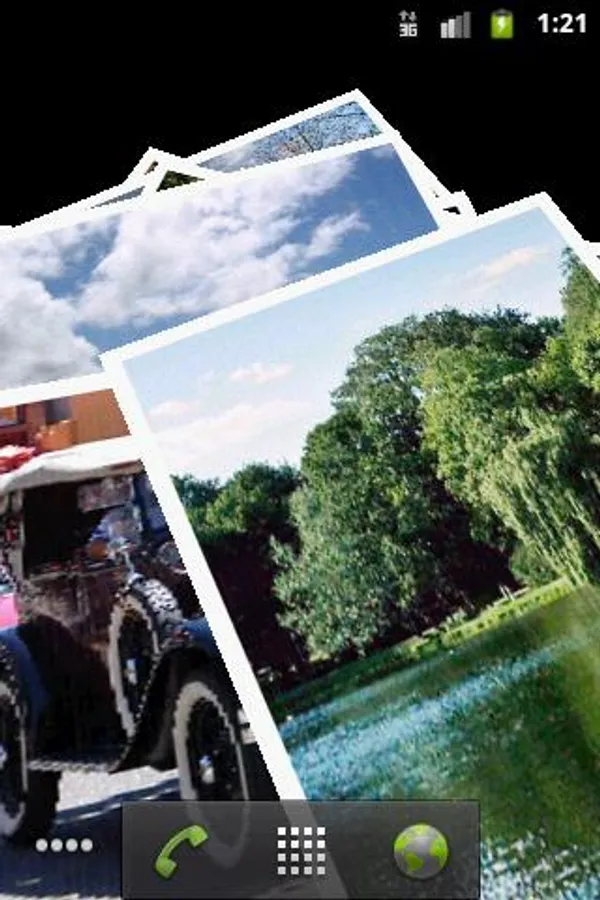 Falling Images - live wallpaper. Wallpaper perfect for those who do not have time to view the photos on the phone's card, or who can not decide which picture to choose as wallpaper. Wallpaper displays randomly selected images from phone's external memory, animating them in 3D space. Changing the desktop moves observer camera.