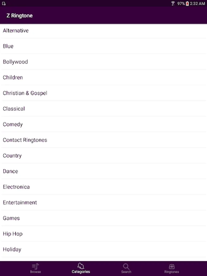 • Many of categories for your phone: Alternative, Blue, Classical, Comedy, Country, Dance, Electronica, Entertainment, Games, Hip Hop, Jazz, Latin, Pet & Animals, Pop, R&B/Soul, Rock, Christmas, New Year, NYE, Holiday party and many many more.